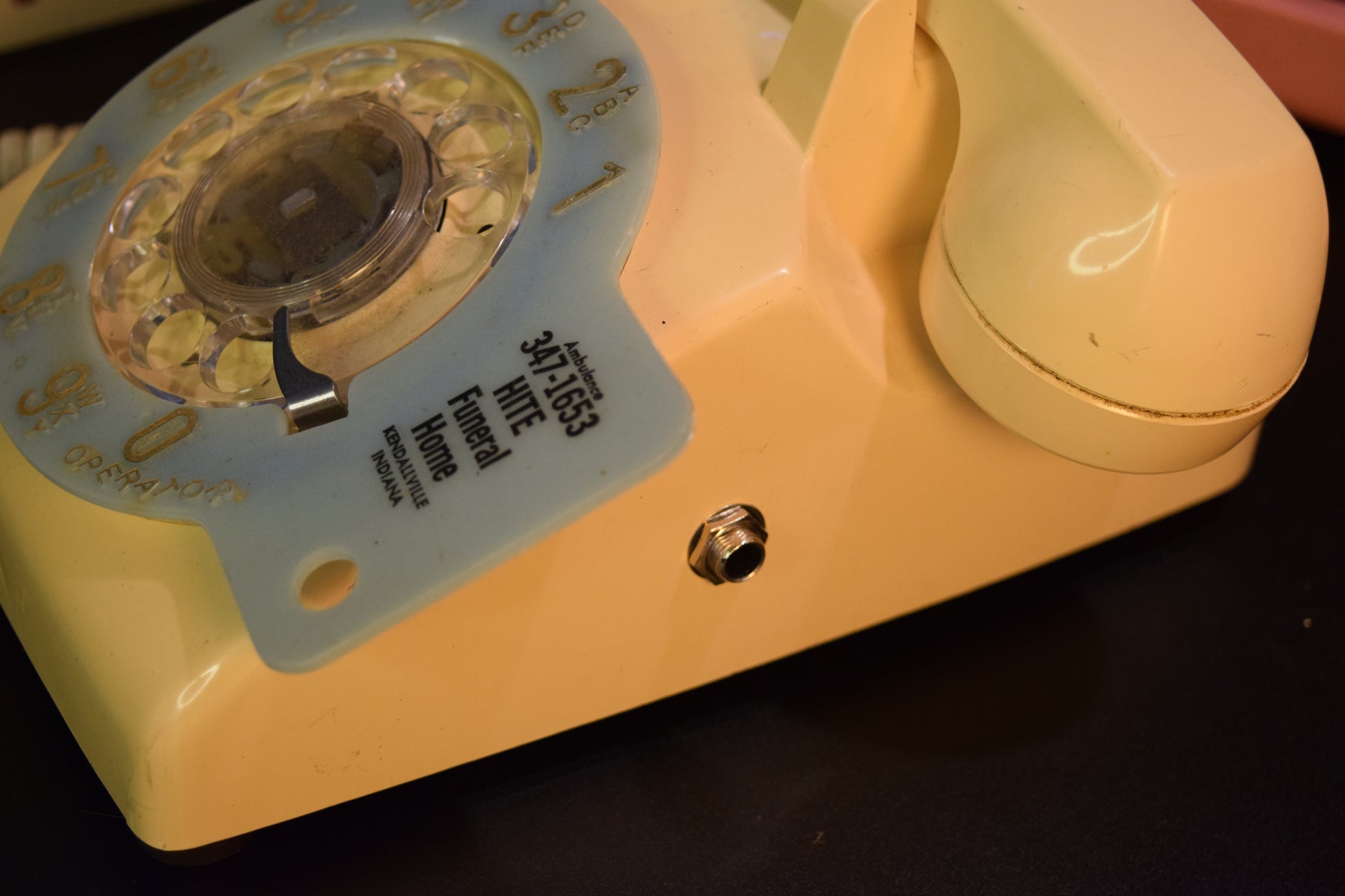 Hand-assembled microphone created from an old Stromberg-Carlson Model 500 telephone. The dial ring is from a funeral home and glows in the dark.