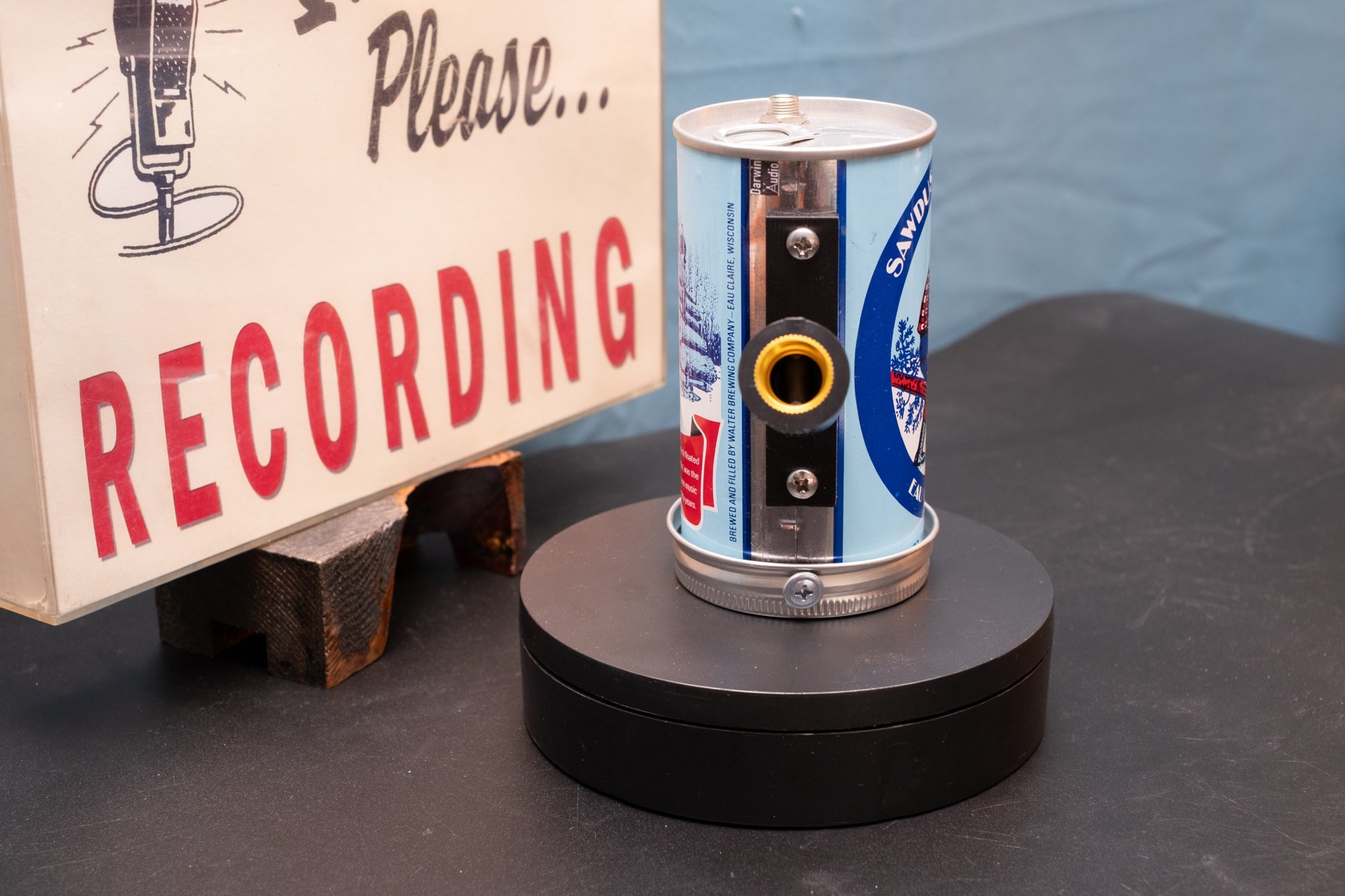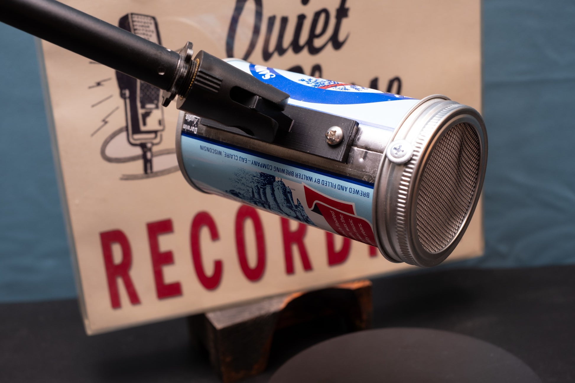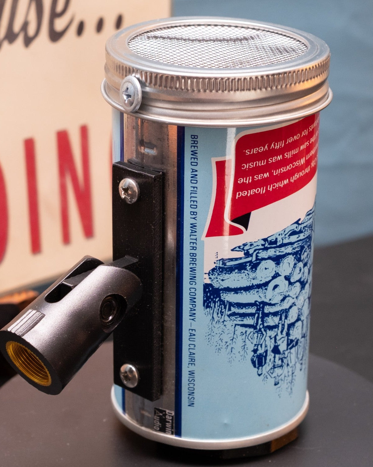 Hand-assembled lo-fi microphone made from a solid steel beer can from the 1970s. Extremely limited supply since they no longer stamp these types of cans.