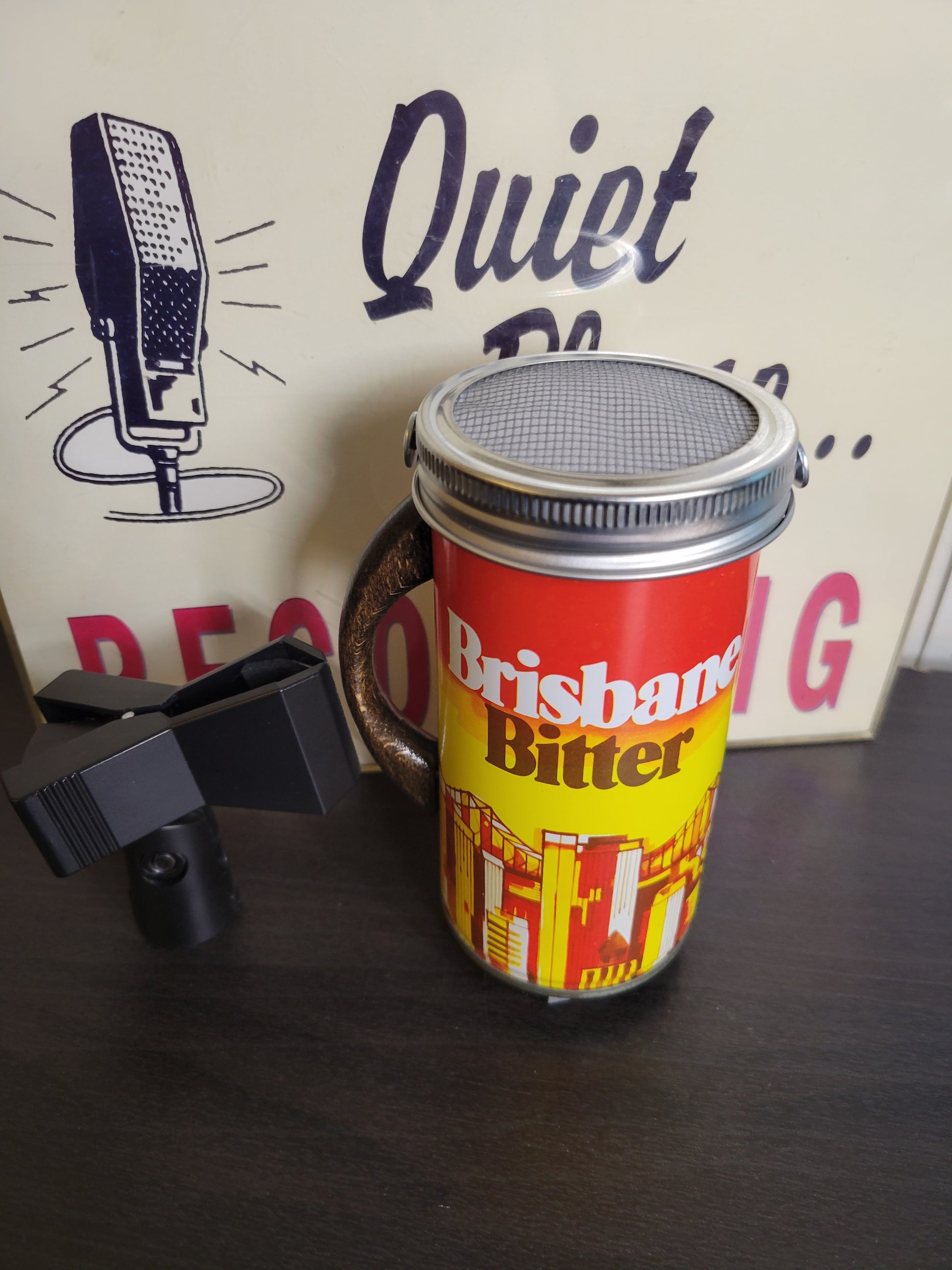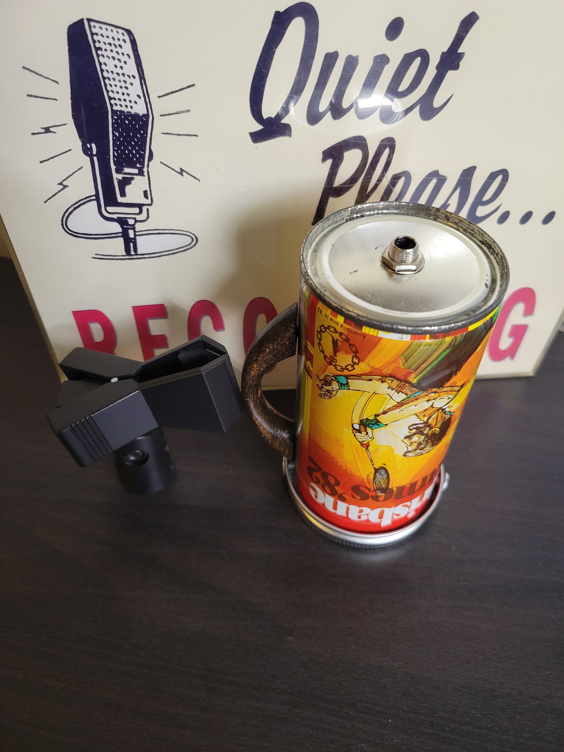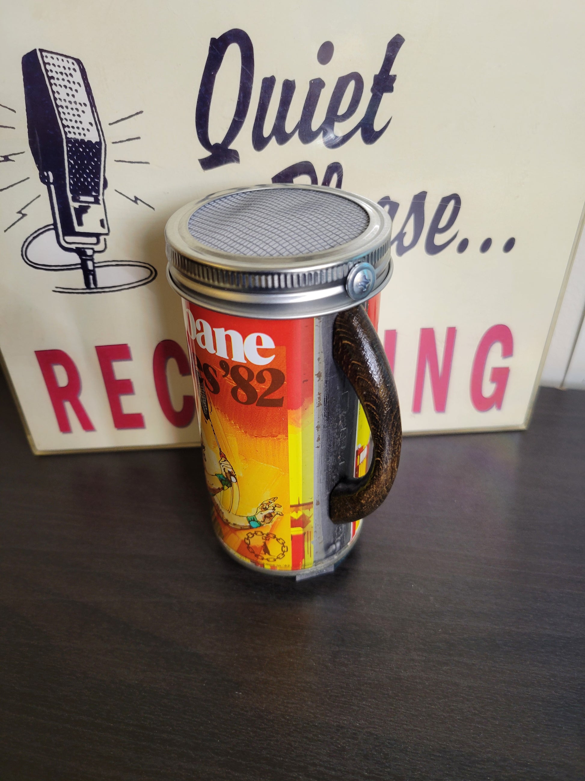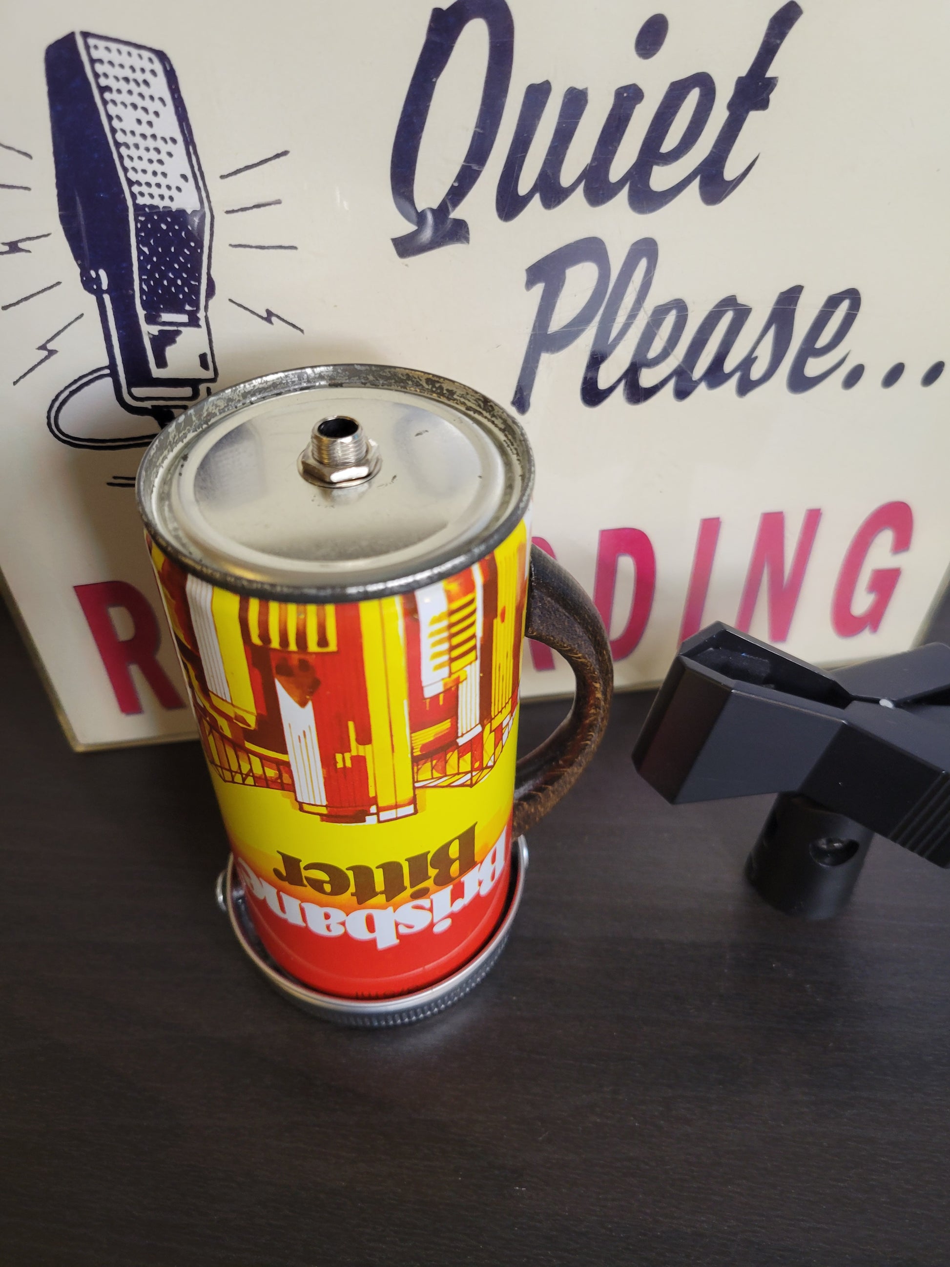 Hand-assembled lo-fi microphone made from a solid steel beer can from the 1982 Brisbane Games; extremely rare since they don't stamp these cans any longer.