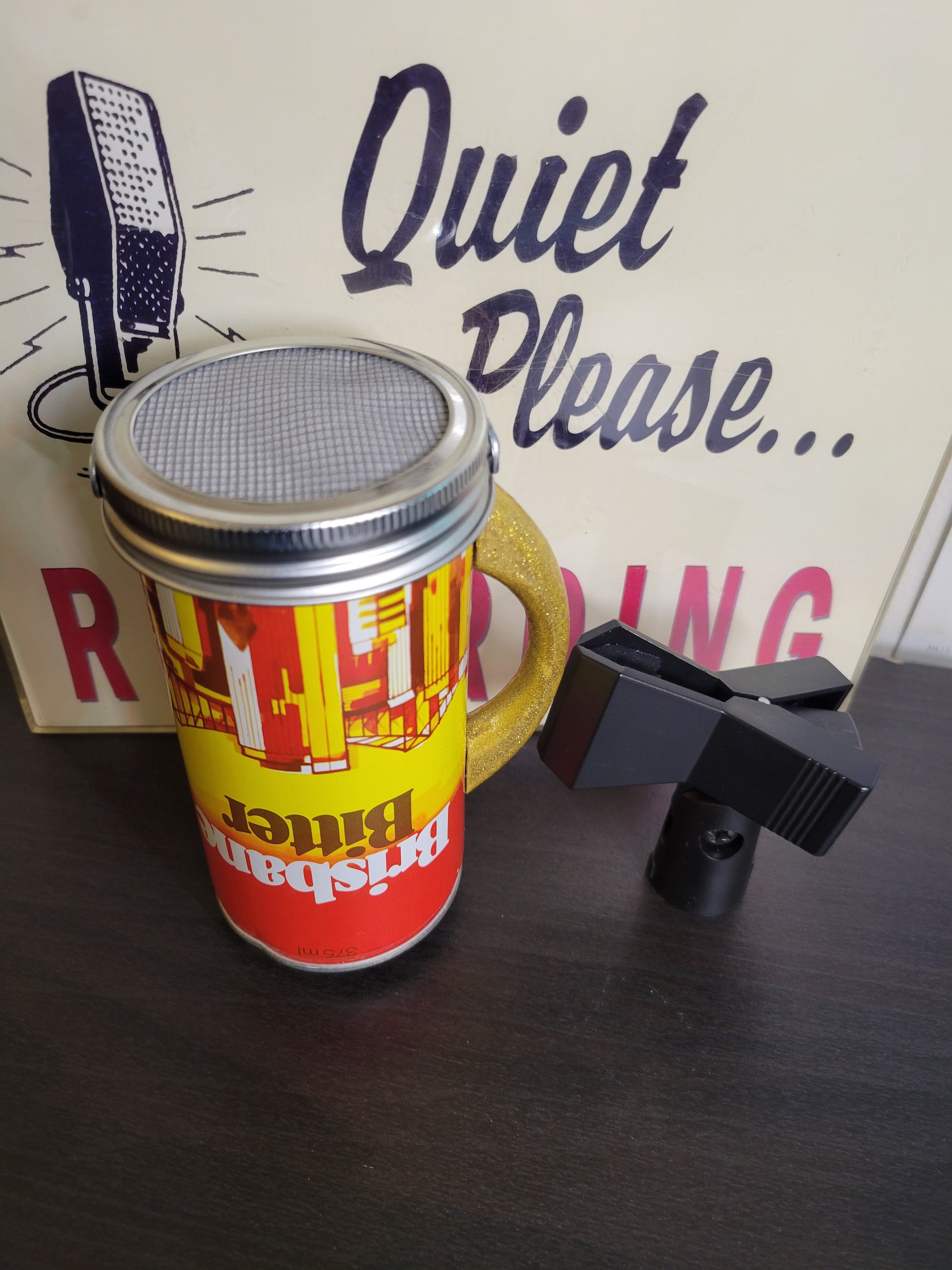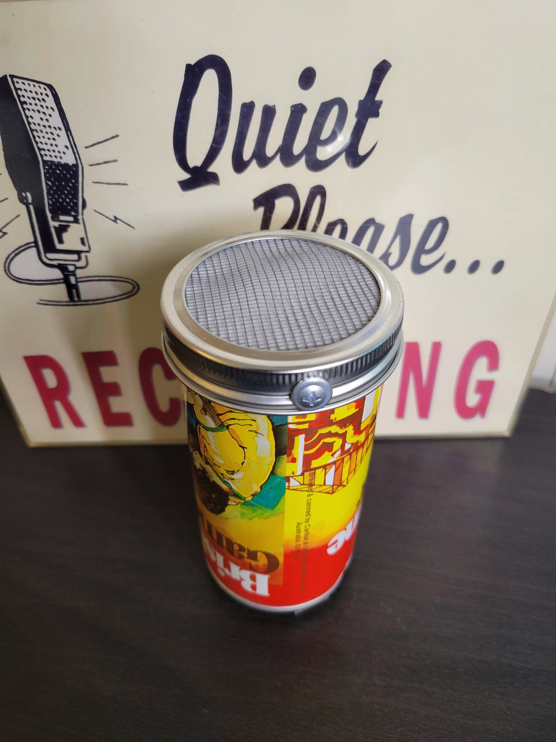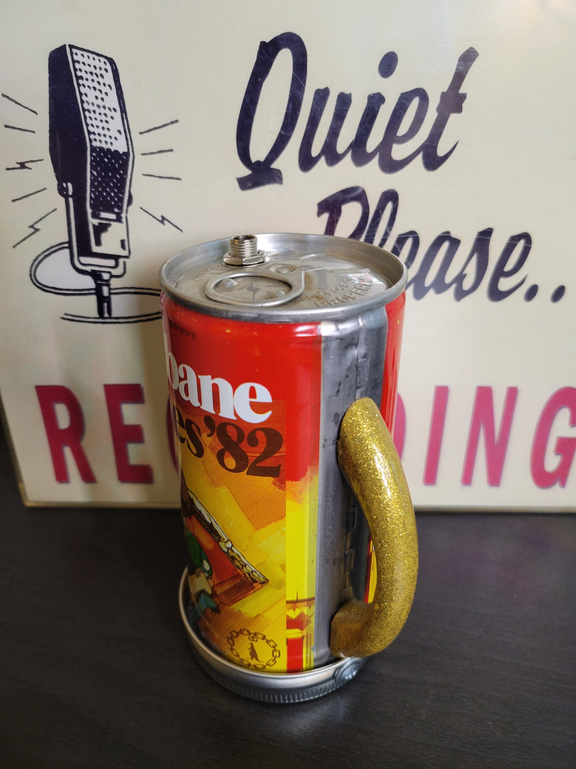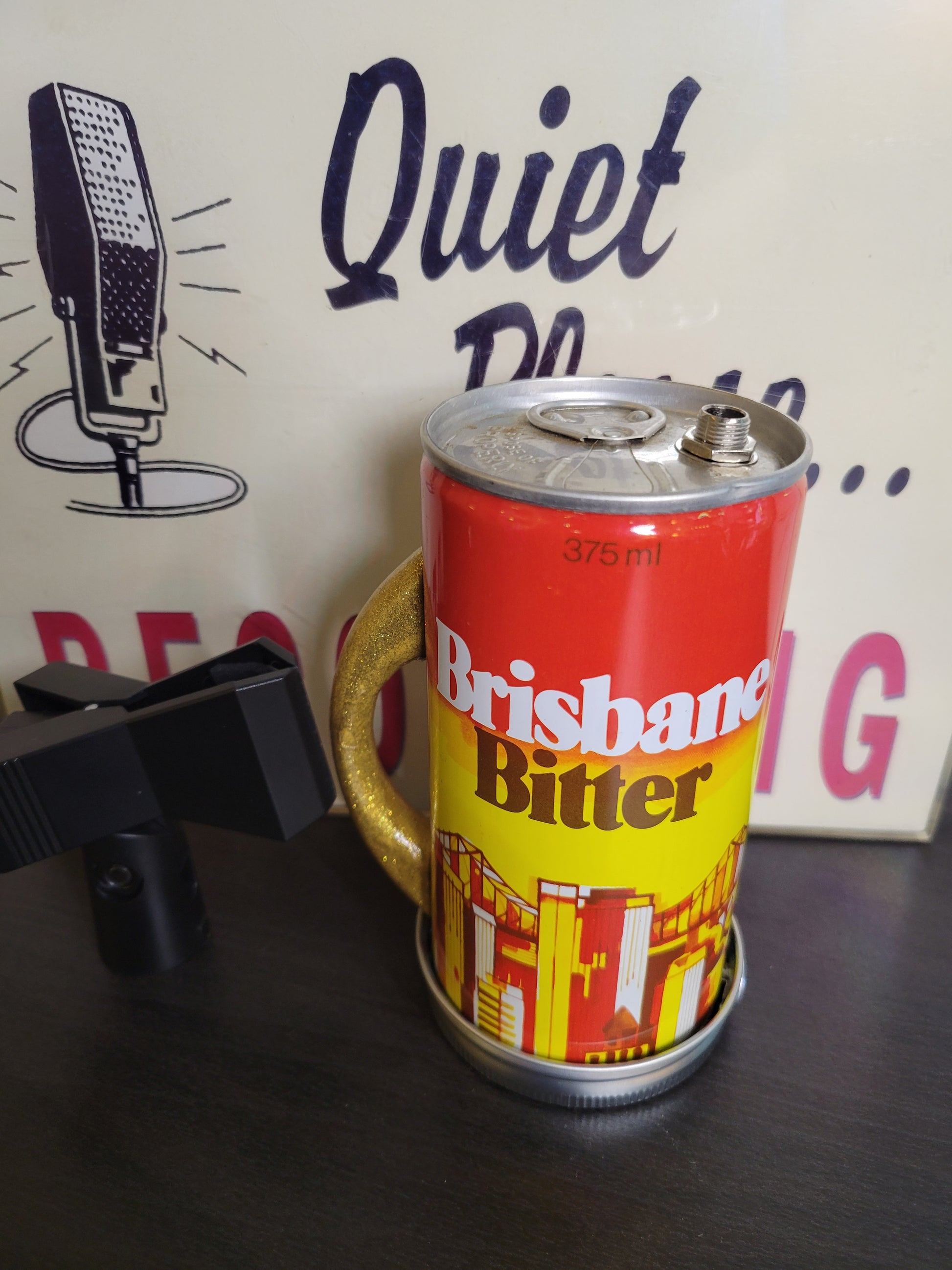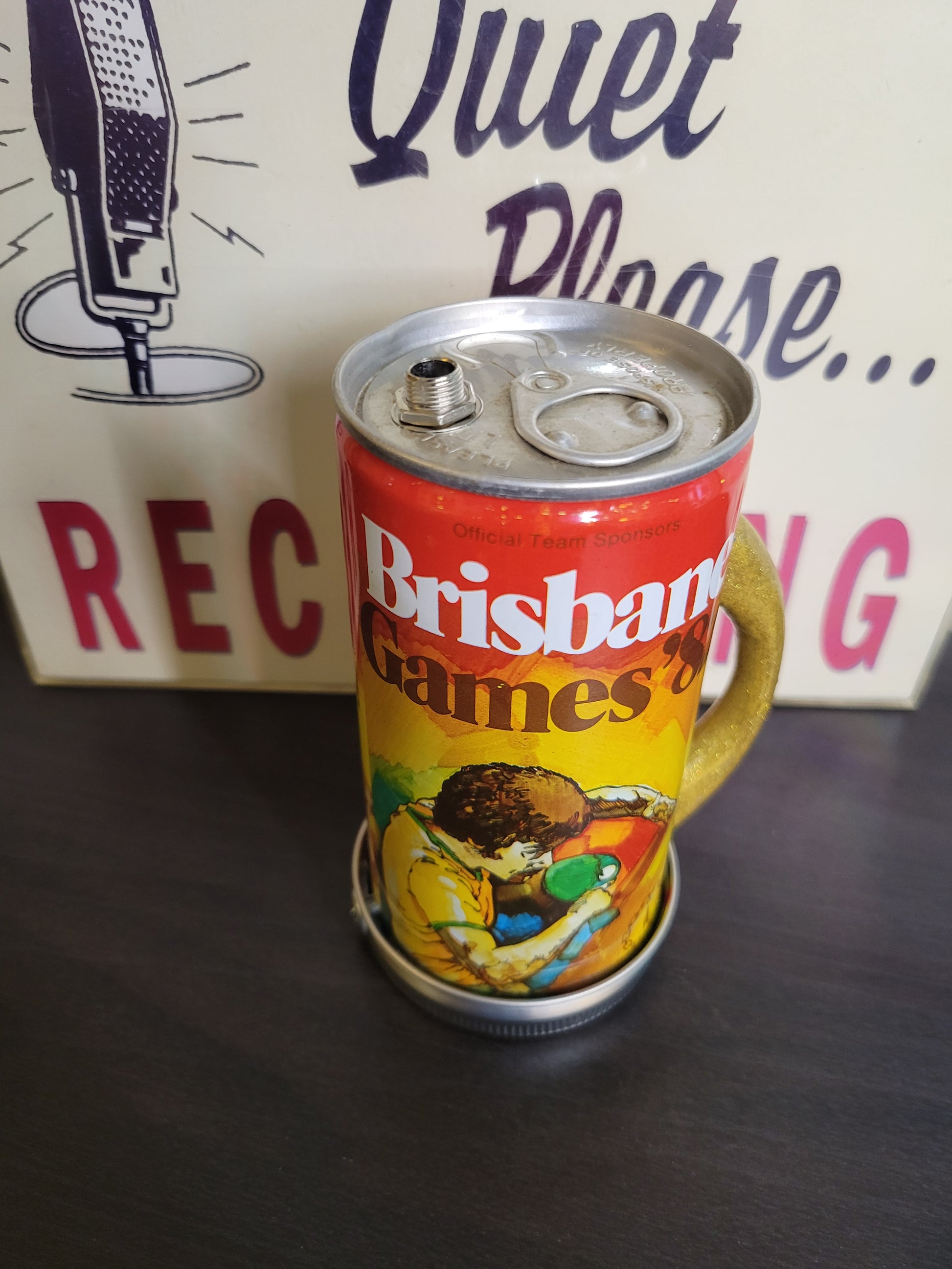 Hand-assembled lo-fi microphone made from a solid steel beer can from the 1982 Brisbane Games; extremely rare since they don't stamp these cans any longer.