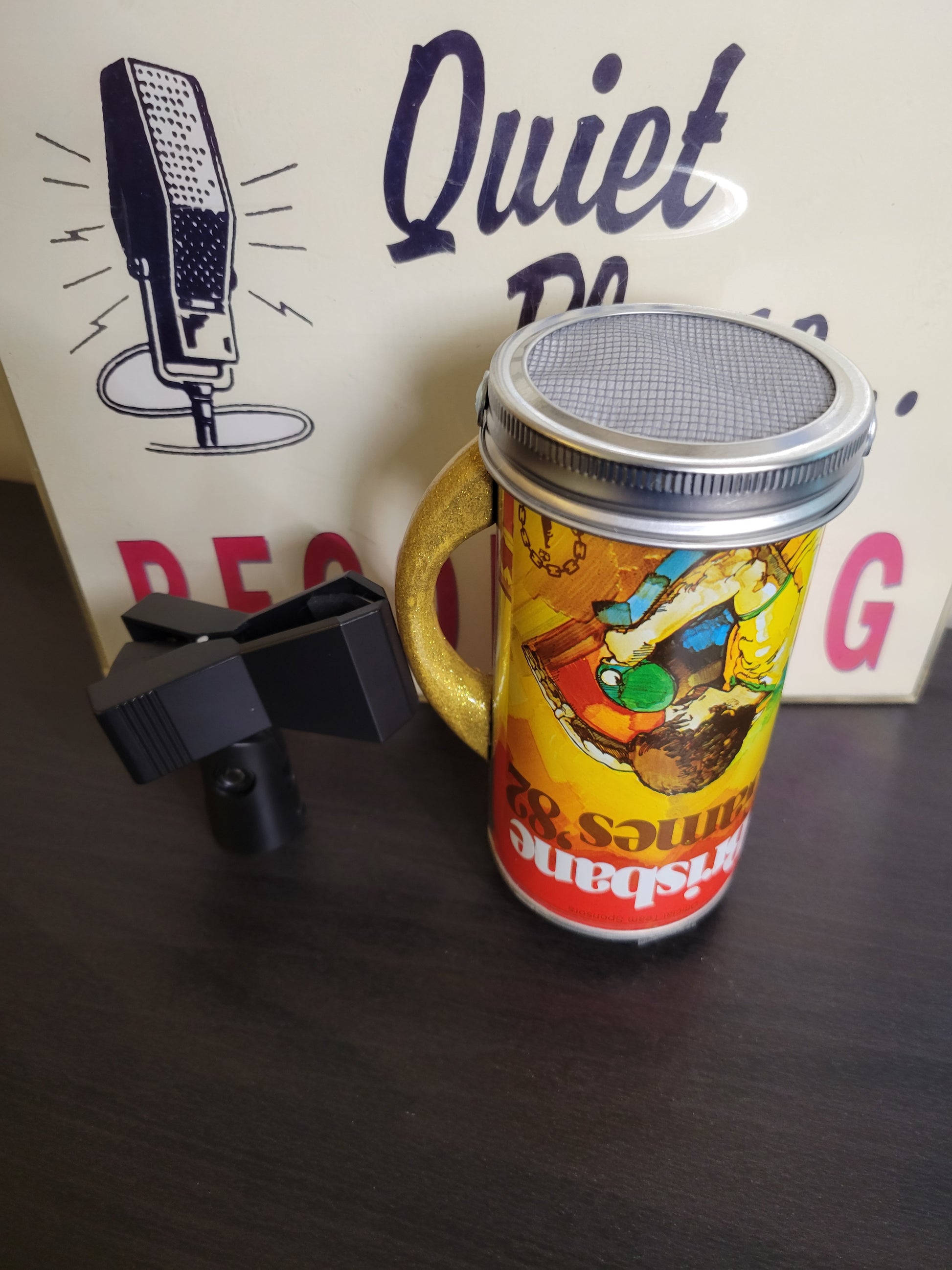 Microphone clip (included) allows for use on stage and in the studio. Also included is a hand-painted golden glitter wooden handle for the beer can to attach to a microphone stand.