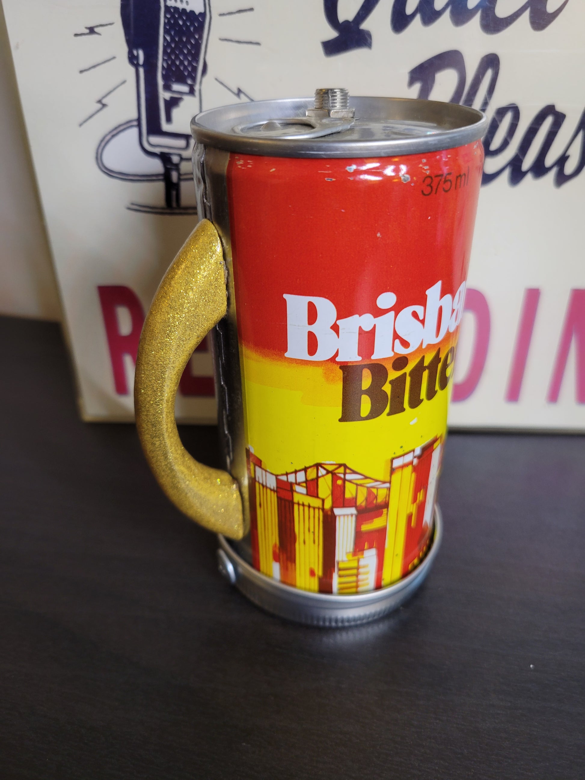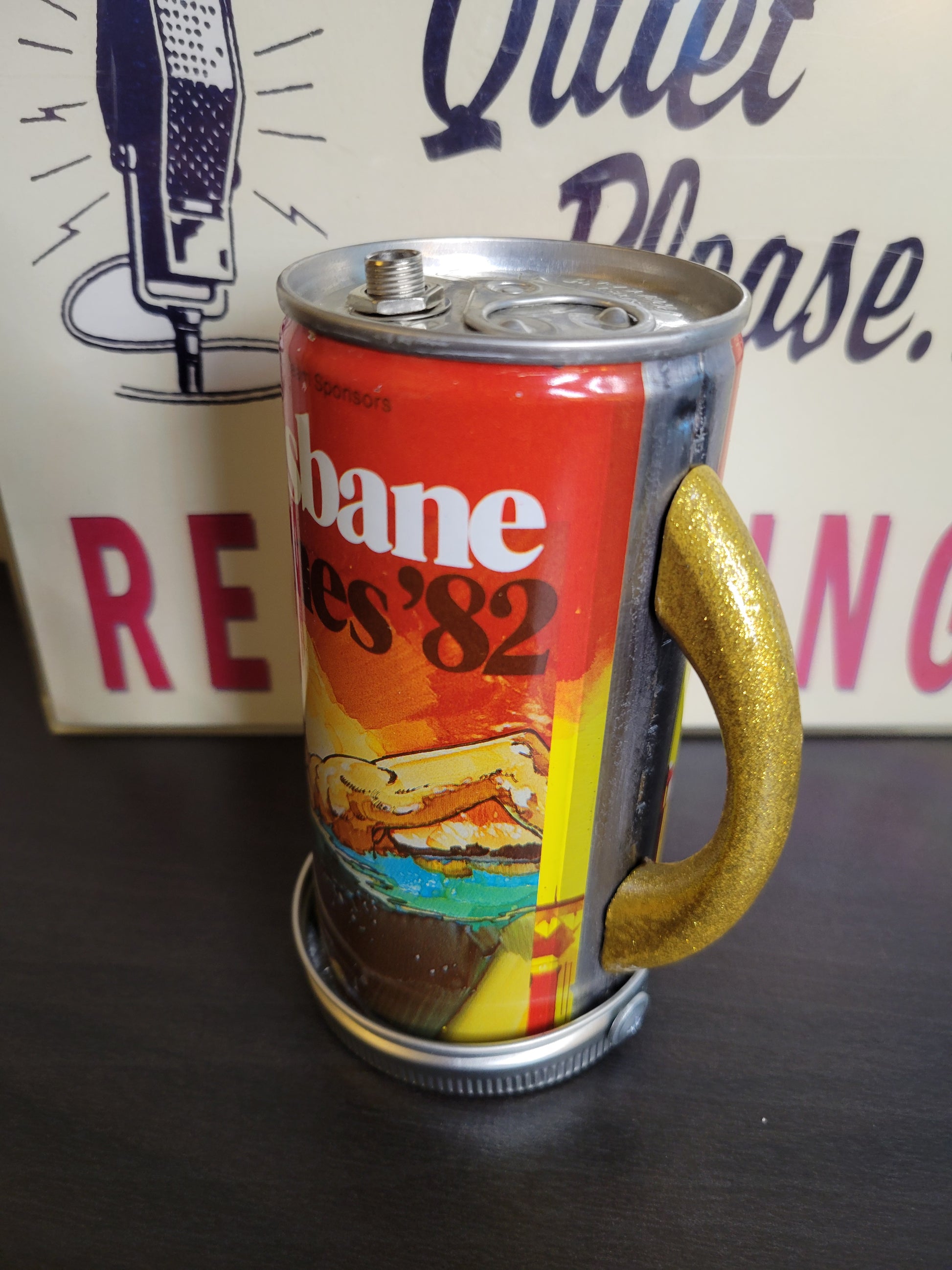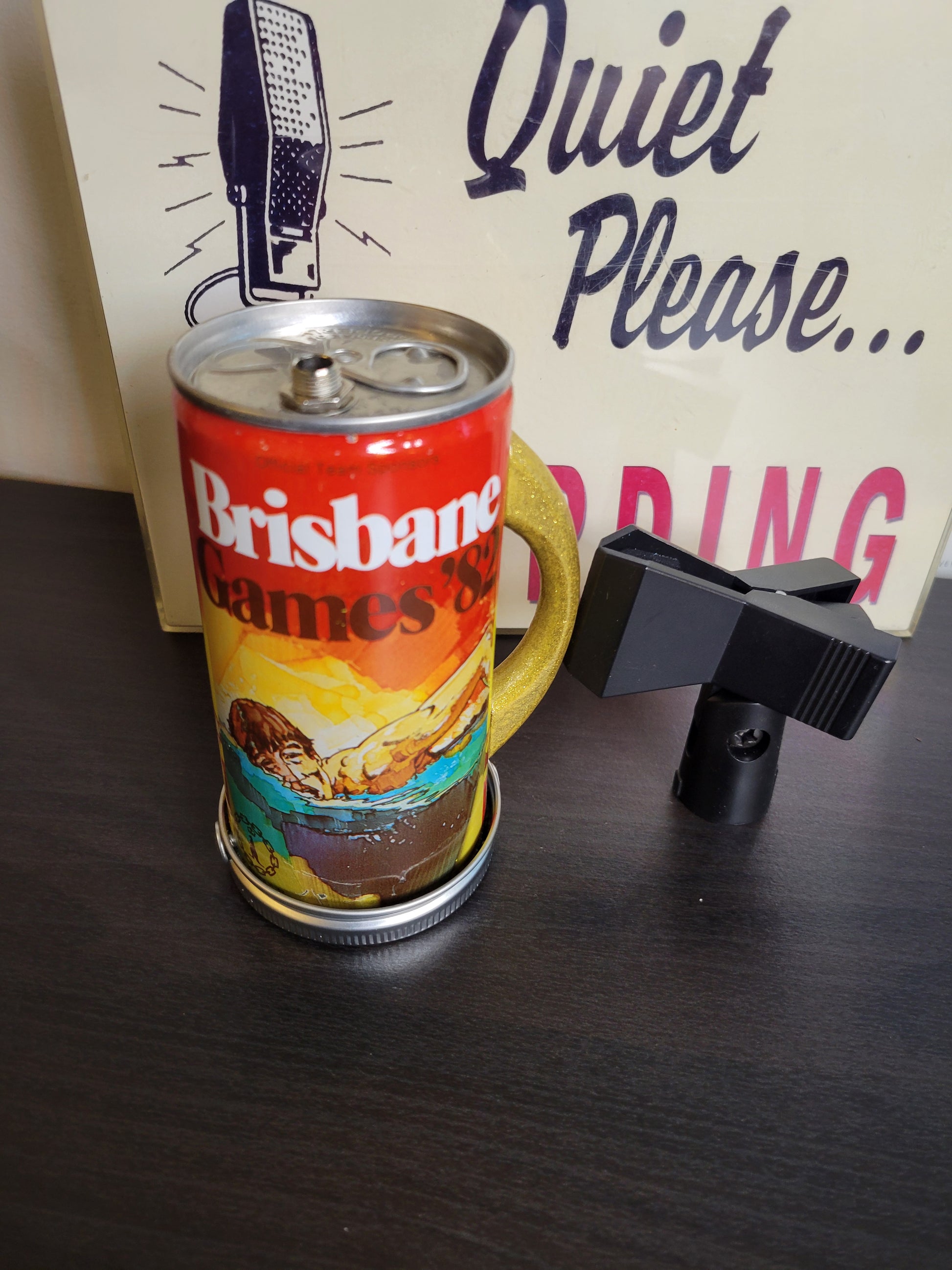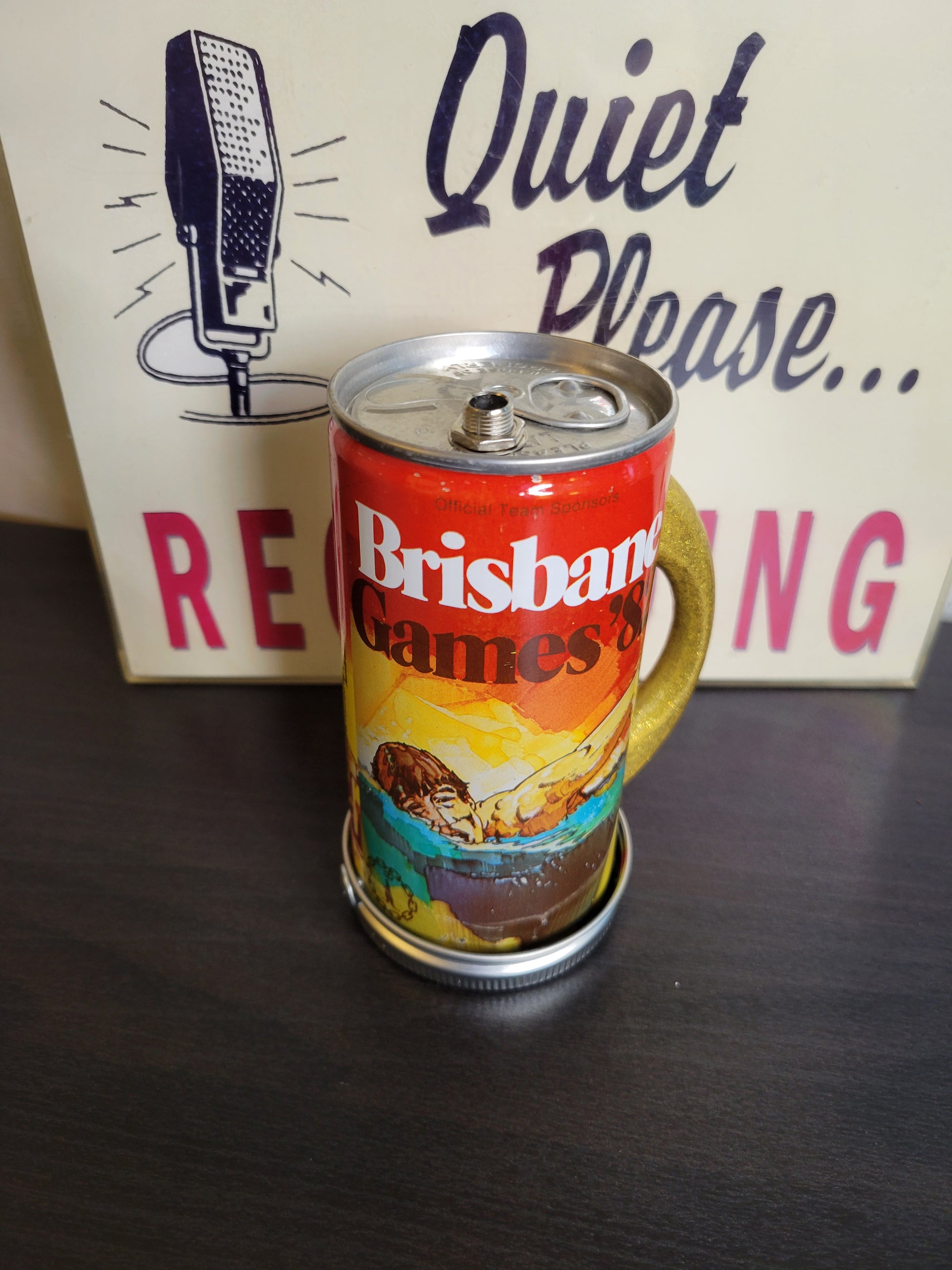 Hand-assembled lo-fi microphone made from a solid steel beer can from the 1982 Brisbane Games; extremely rare since they don't stamp these cans any longer.