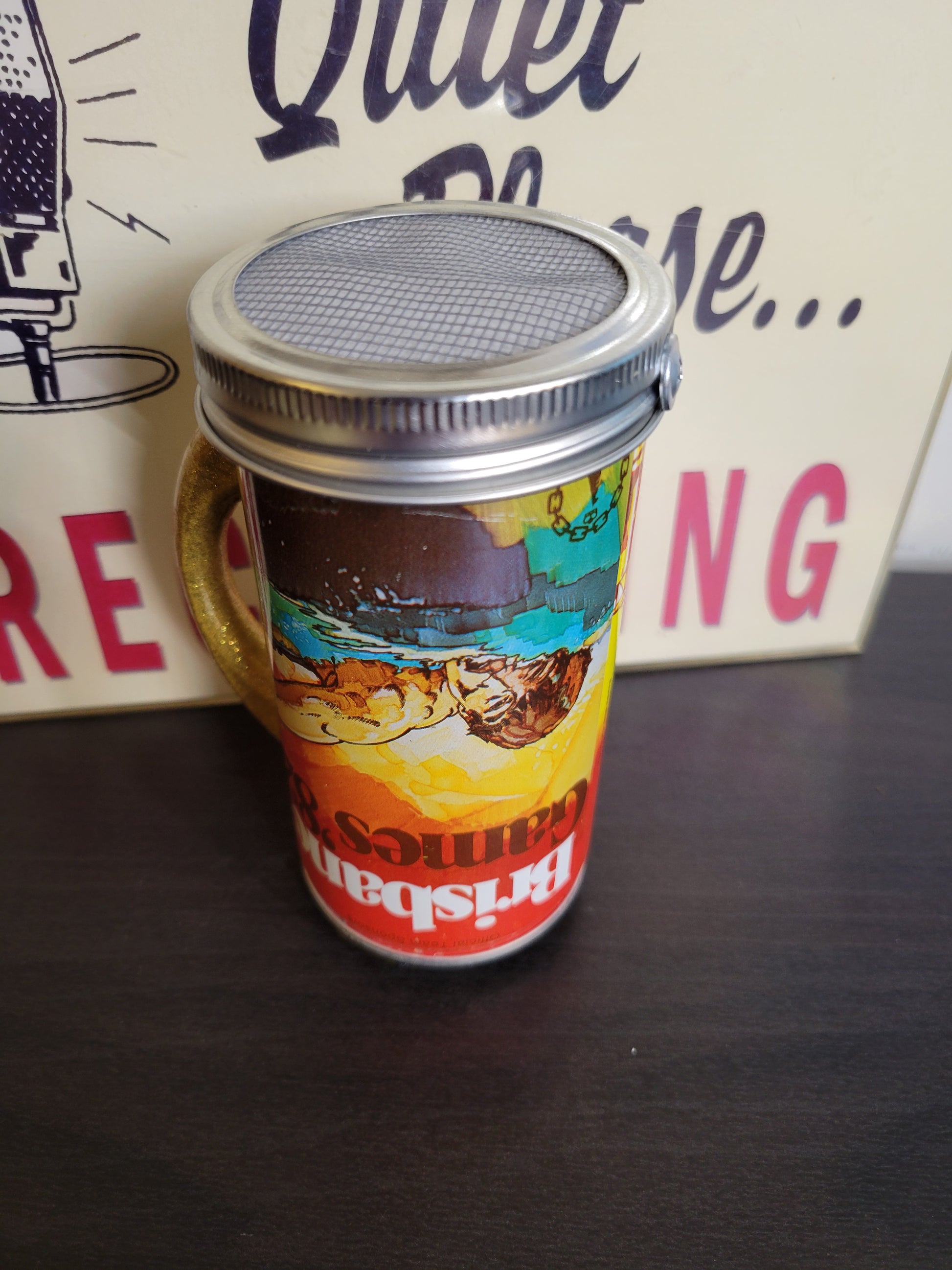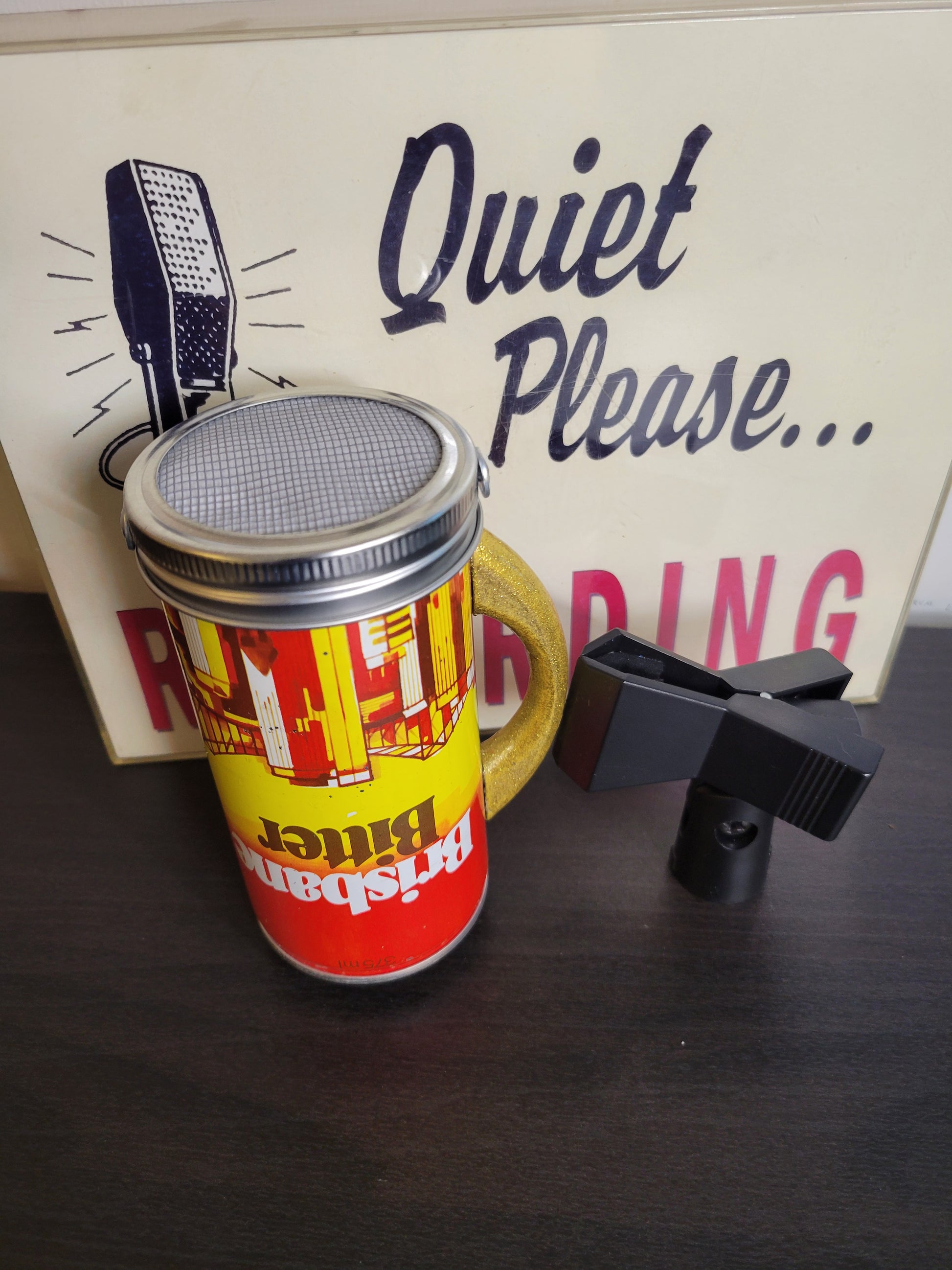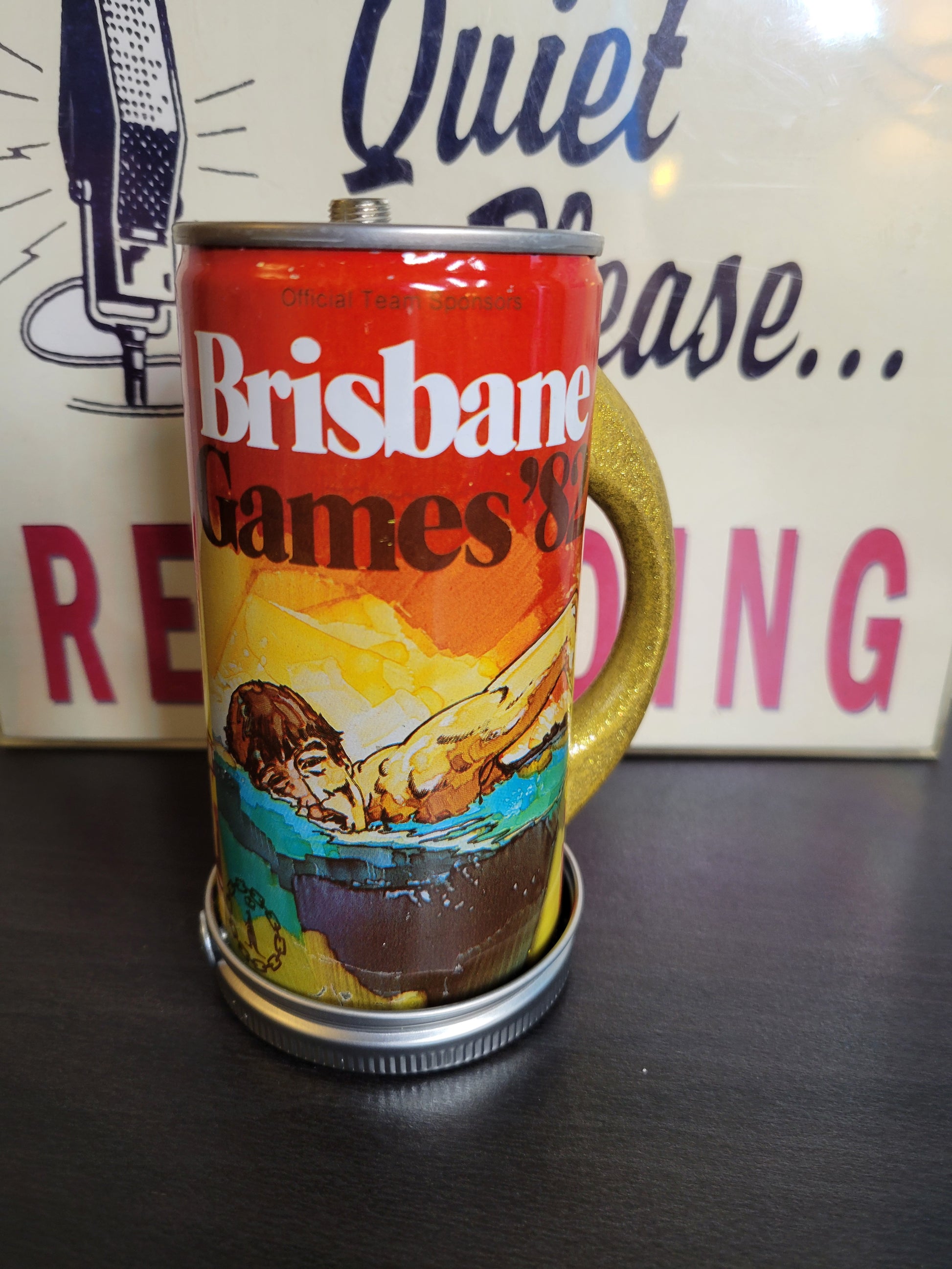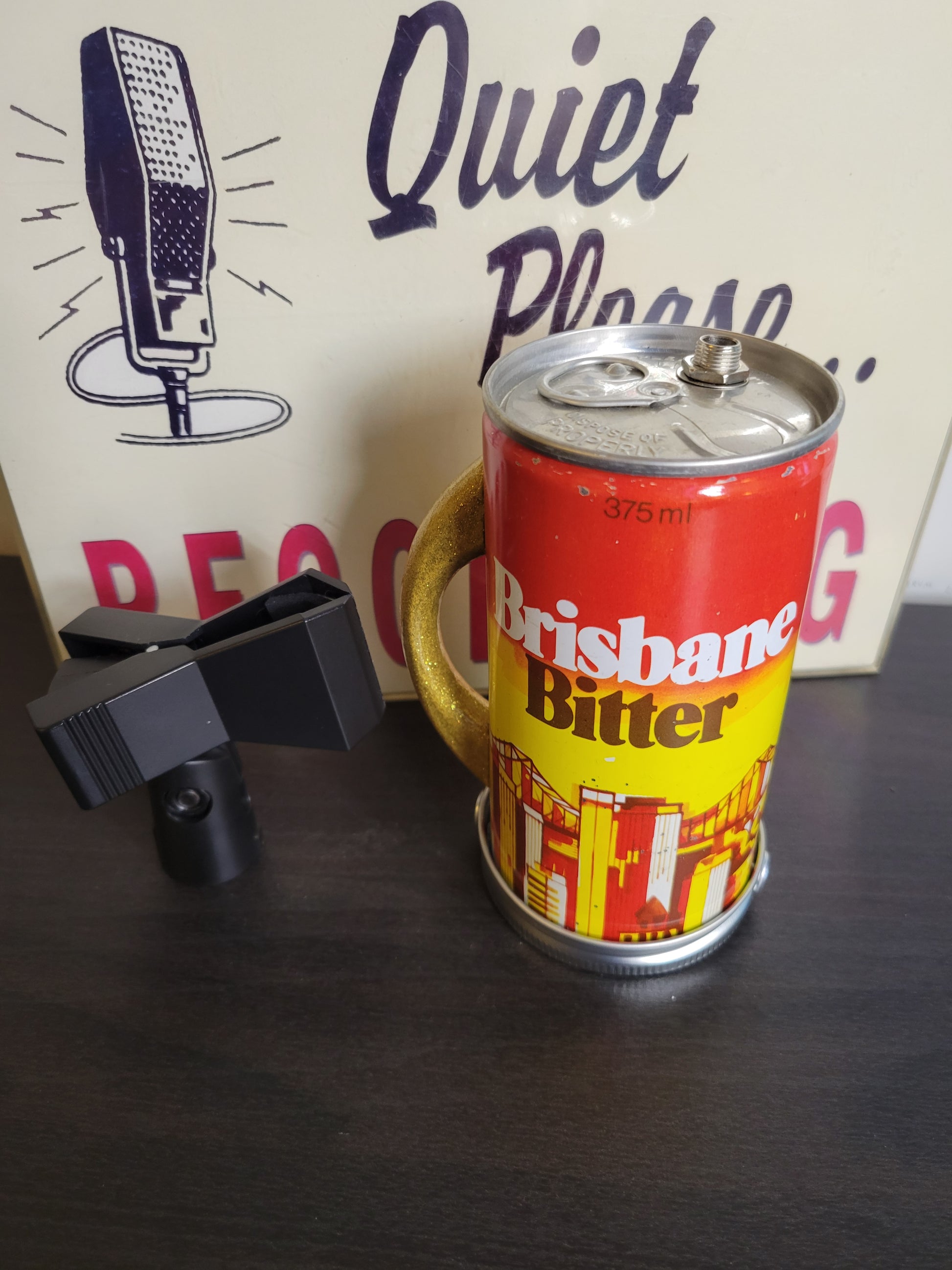 Hand-assembled lo-fi microphone made from a solid steel beer can from the 1982 Brisbane Games; extremely rare since they don't stamp these cans any longer.