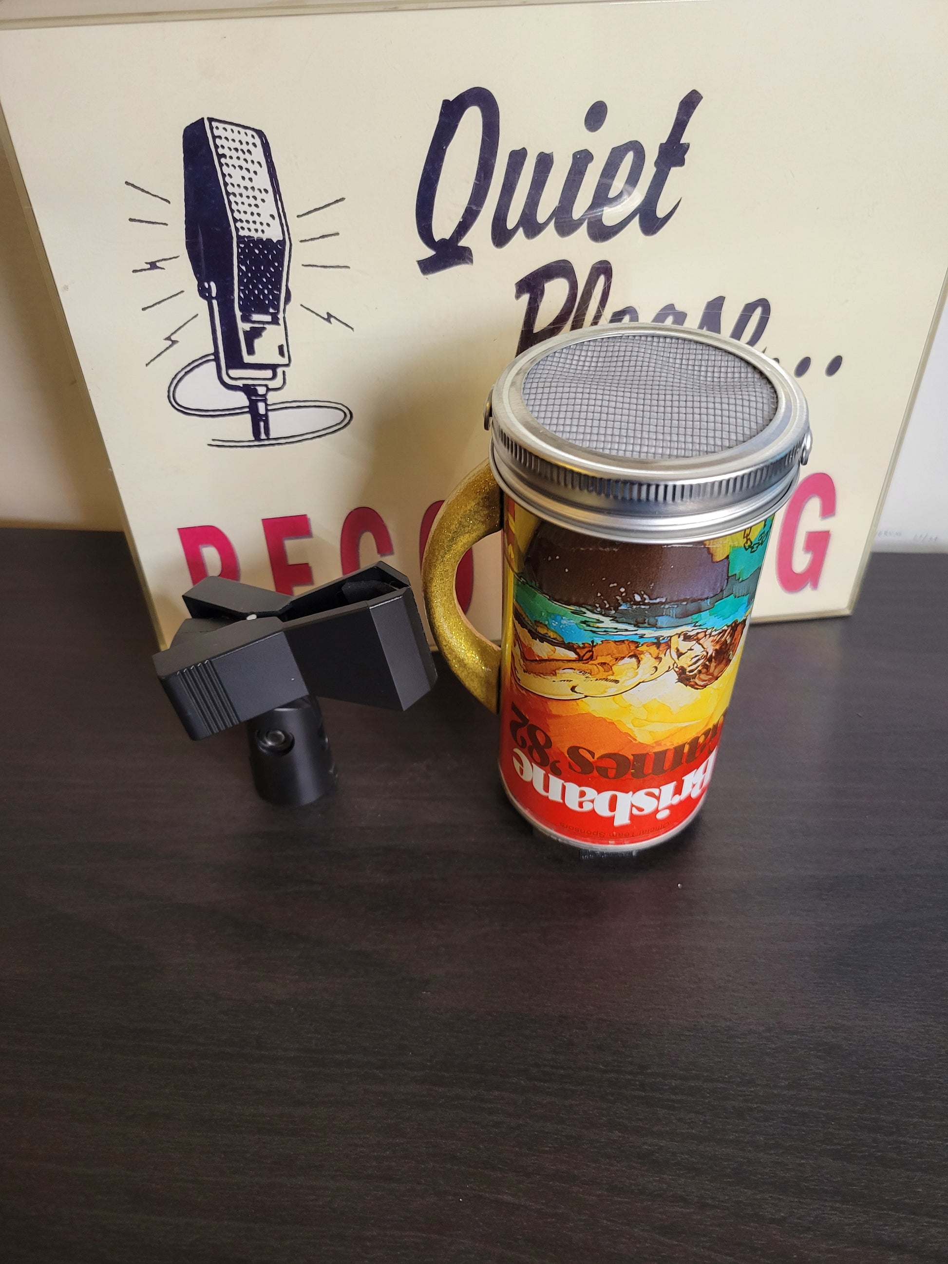 Microphone clip (included) allows for use on stage and in the studio. Also included is a hand-painted golden glitter wooden handle for the beer can to attach to a microphone stand.