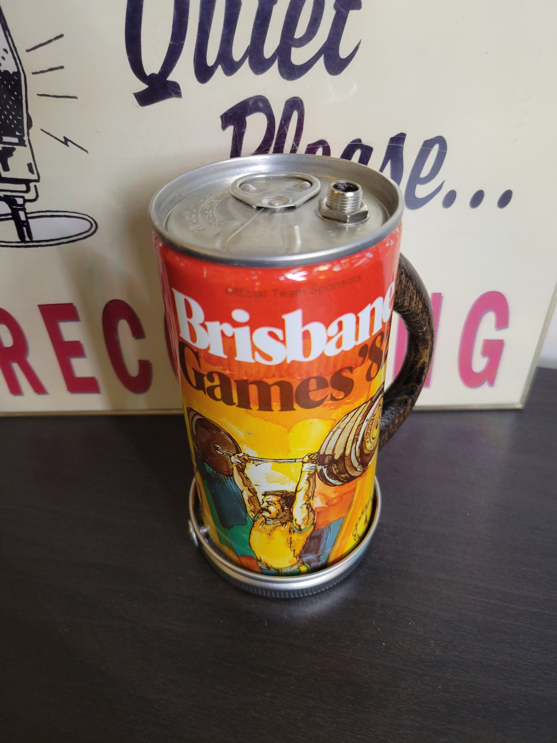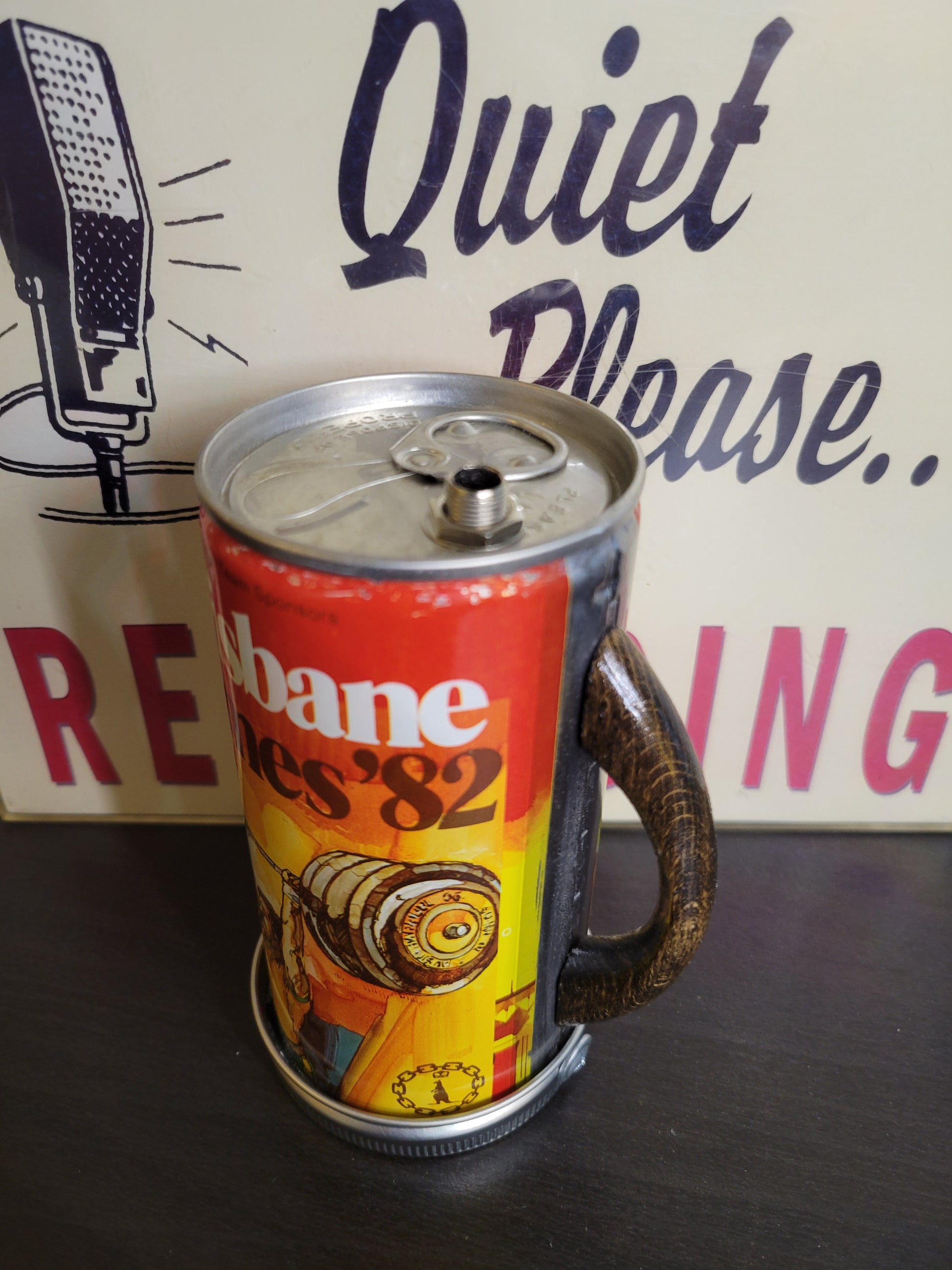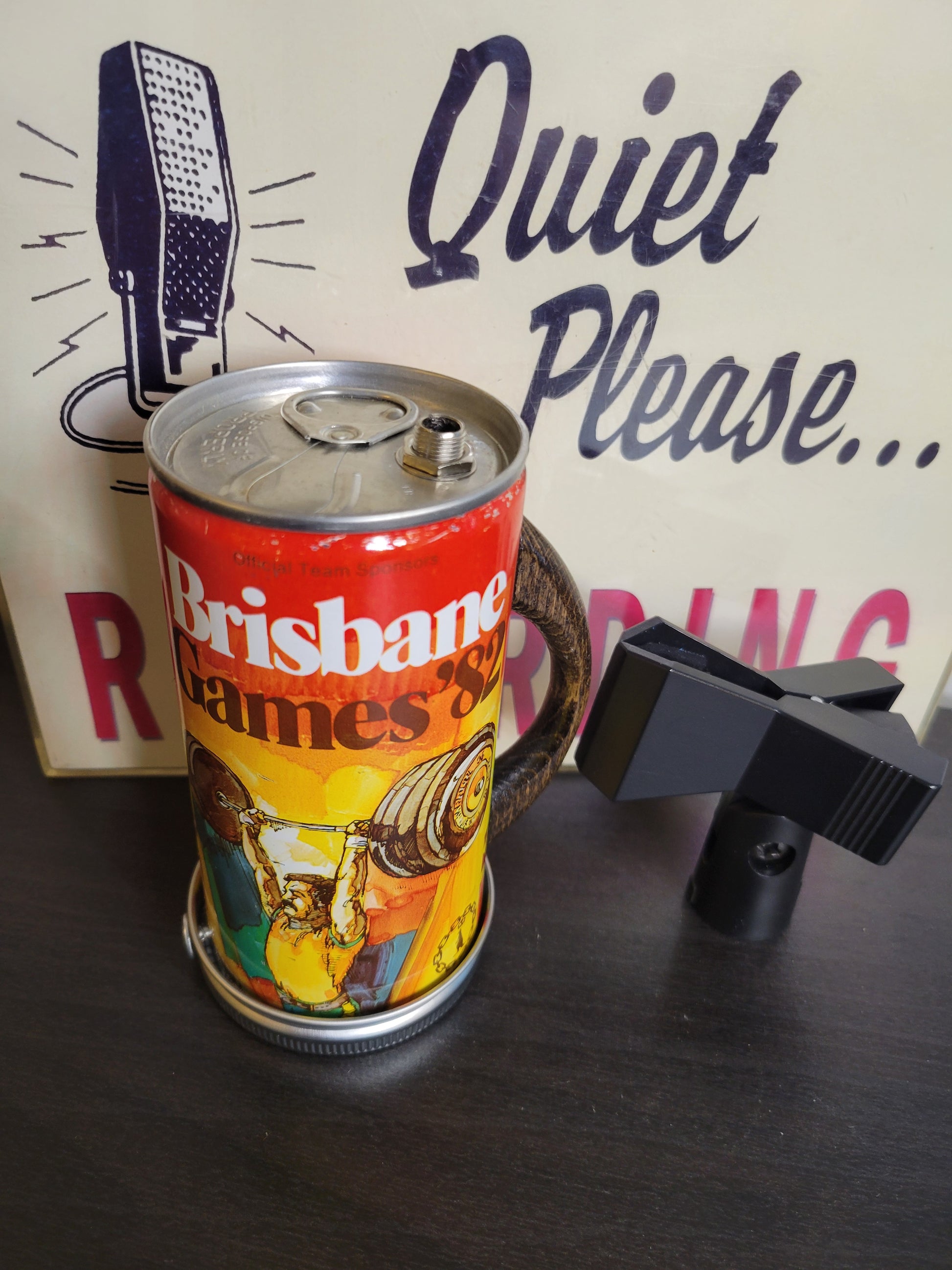 Hand-assembled lo-fi microphone made from a solid steel beer can from the 1982 Brisbane Games; extremely rare since they don't stamp these cans any longer.