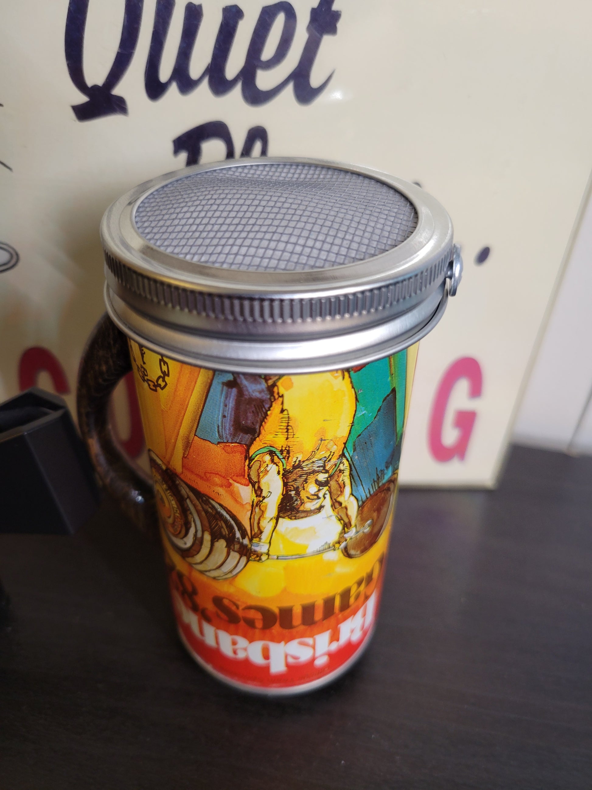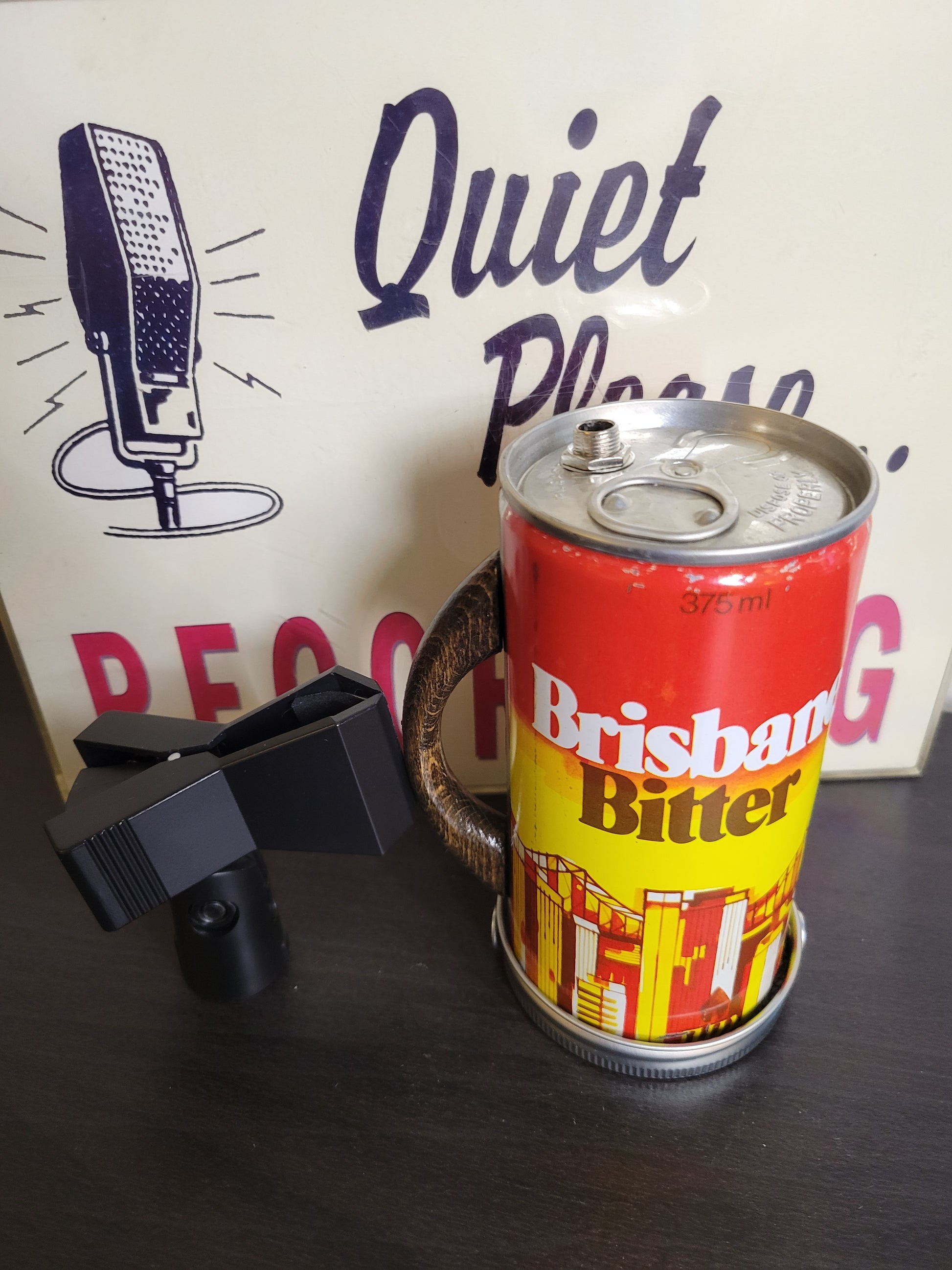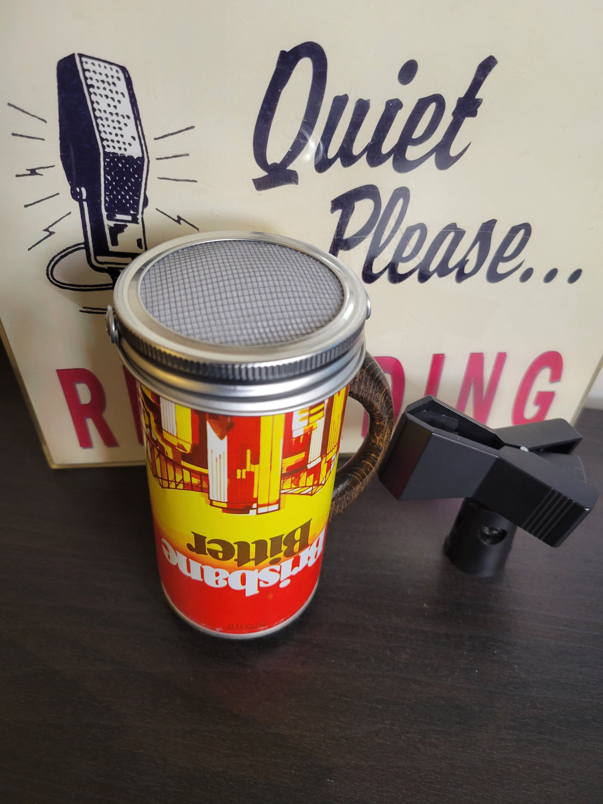 Hand-assembled lo-fi microphone made from a solid steel beer can from the 1982 Brisbane Games; extremely rare since they don't stamp these cans any longer.
