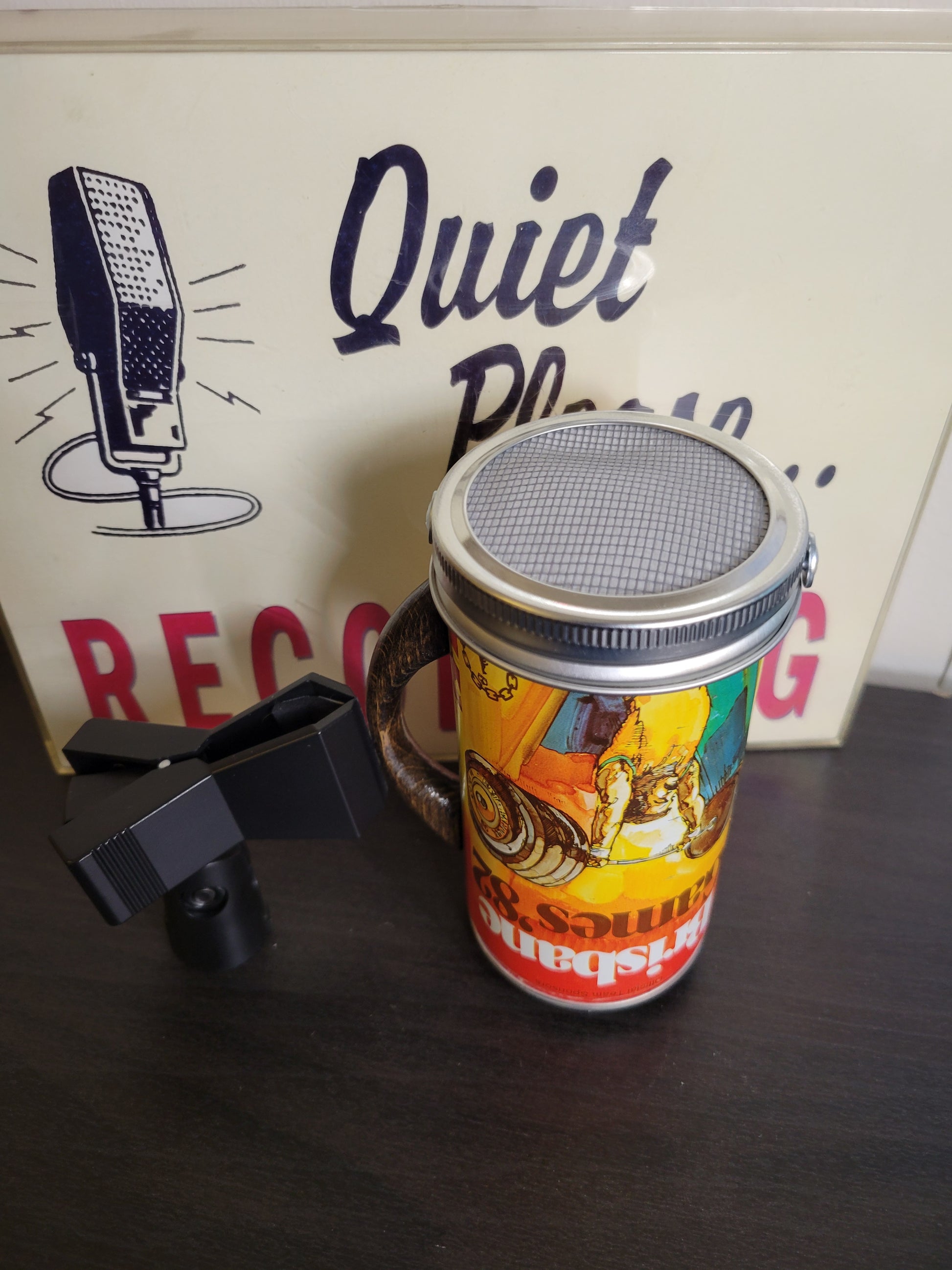 Microphone clip (included) allows for use on stage and in the studio. Also included is a hand-painted golden glitter wooden handle for the beer can to attach to a microphone stand.