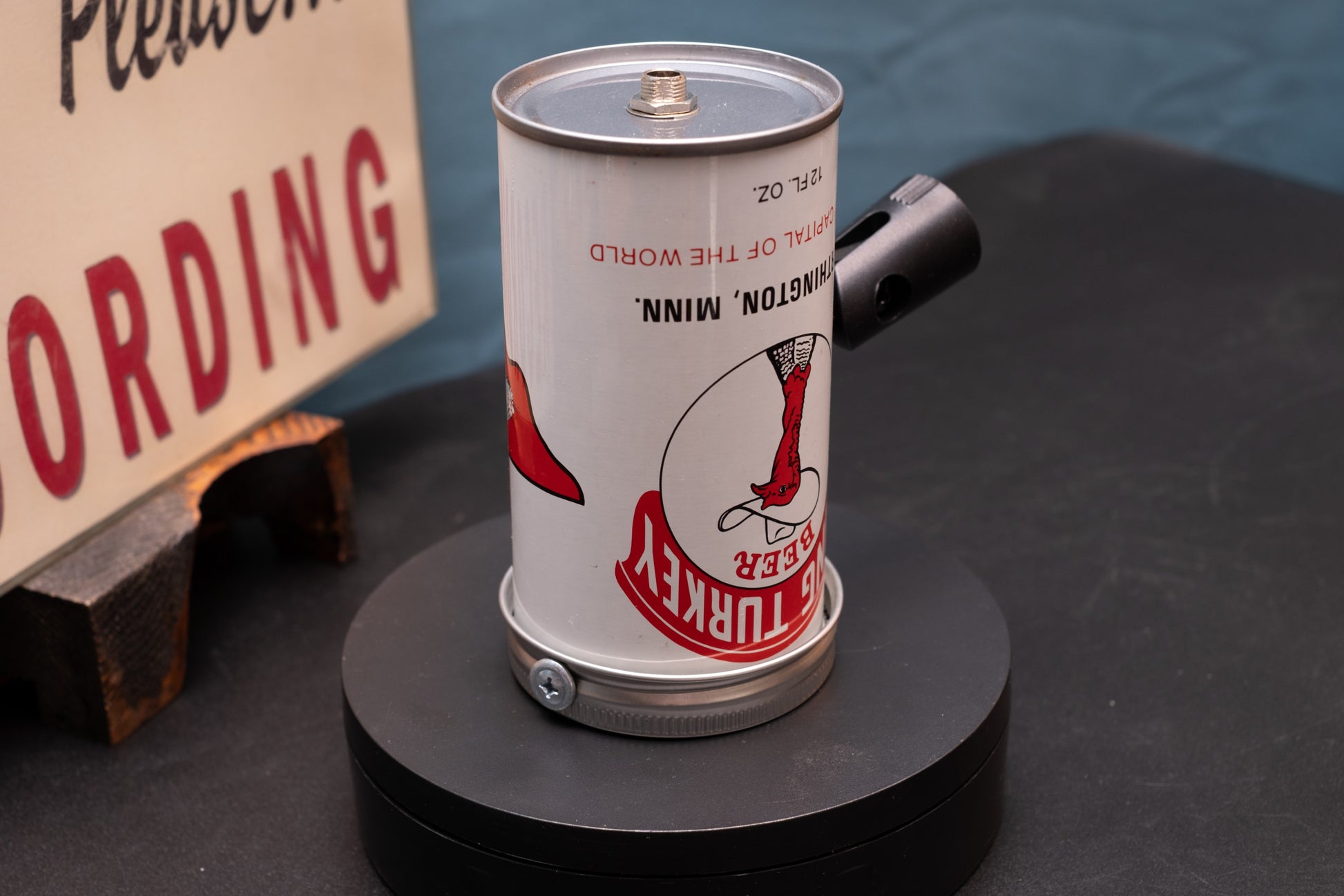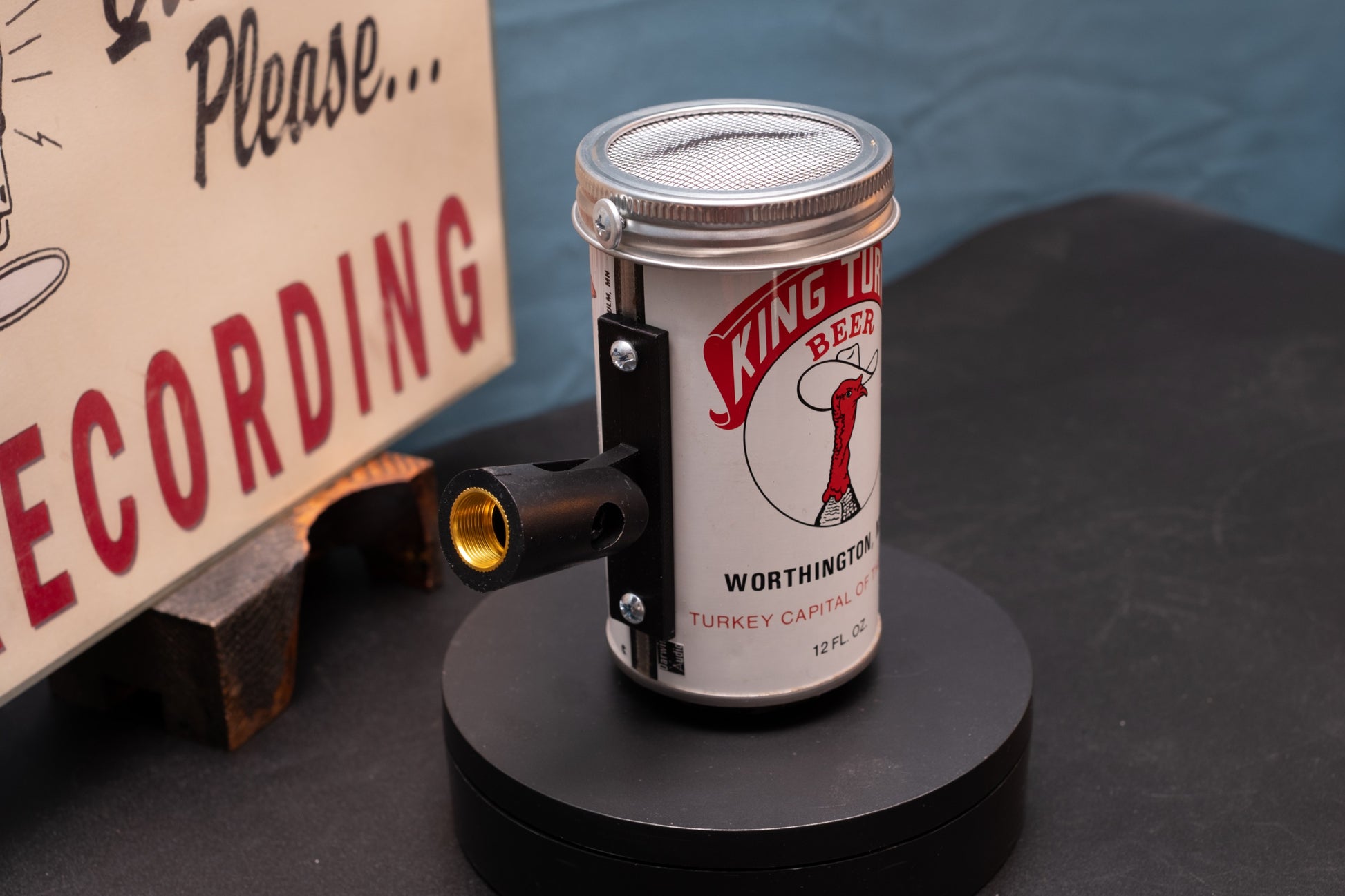Hand-assembled lo-fi microphone made from a solid steel beer can from the 1970s. Extremely limited supply since they no longer stamp these types of cans.