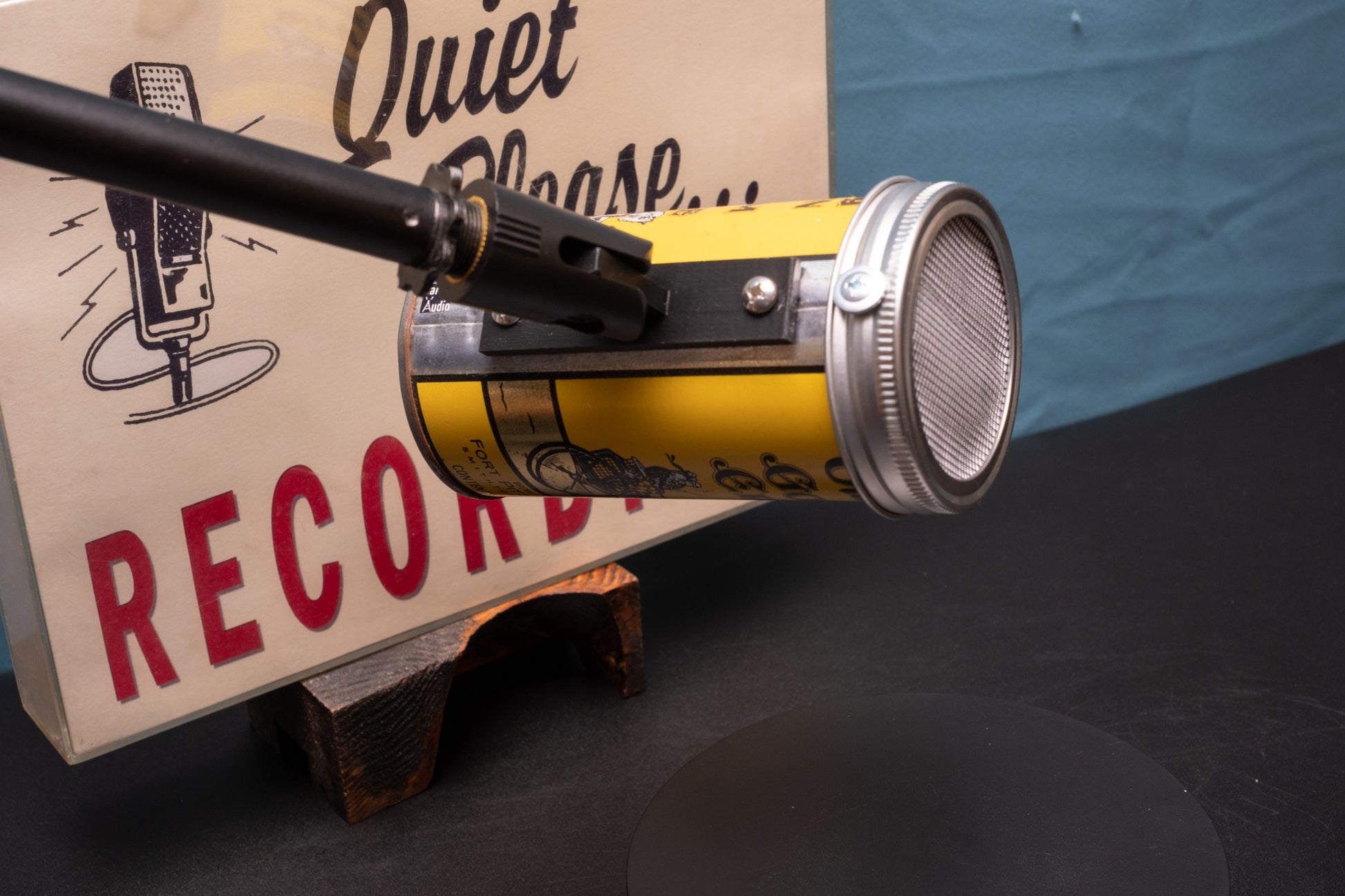 Hand-assembled lo-fi microphone made from a solid steel beer can from the 1970s. Extremely limited supply since they no longer stamp these types of cans.