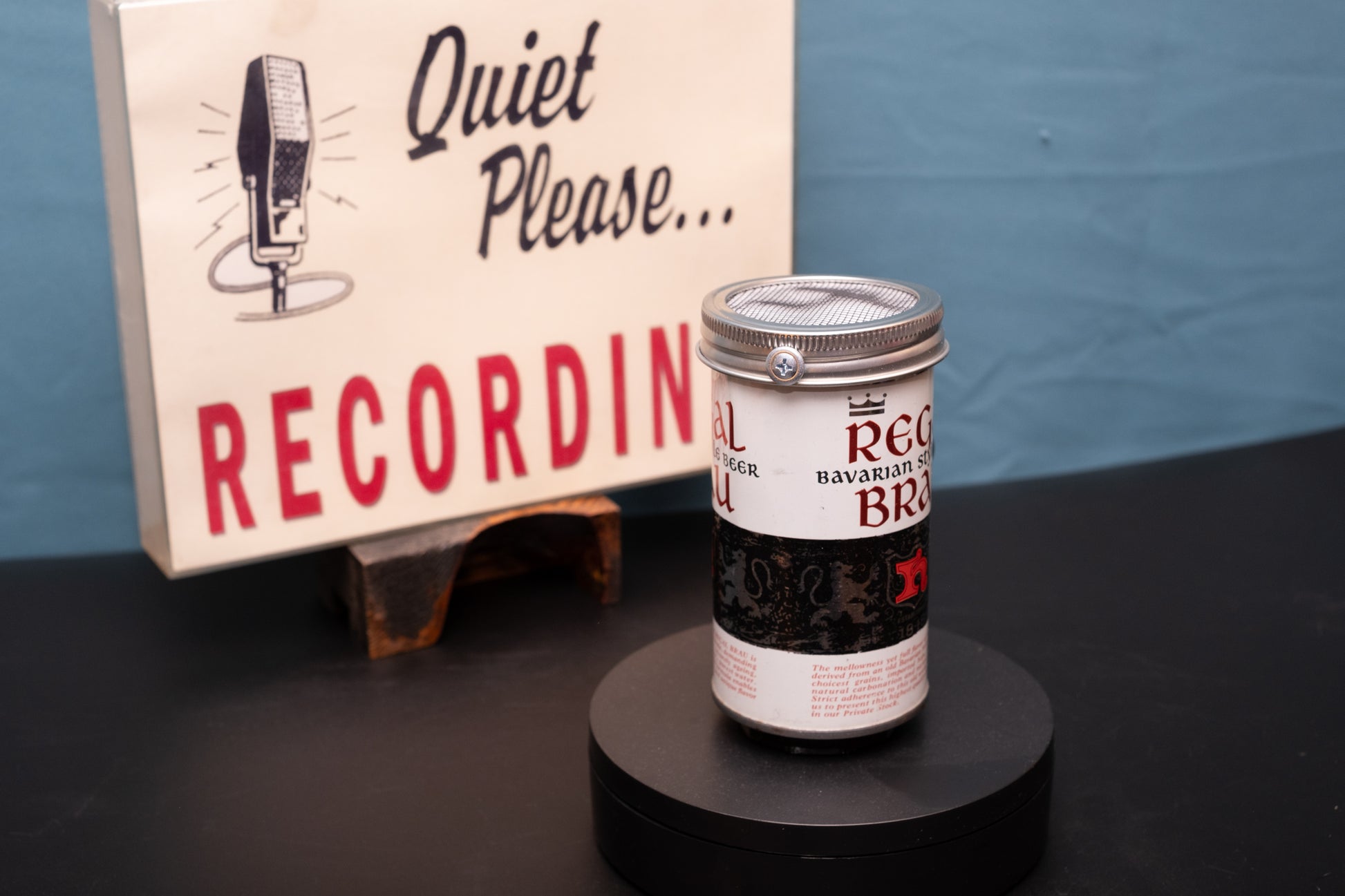 Hand-assembled lo-fi microphone made from a solid steel beer can from the 1970s. Extremely limited supply since they no longer stamp these types of cans.