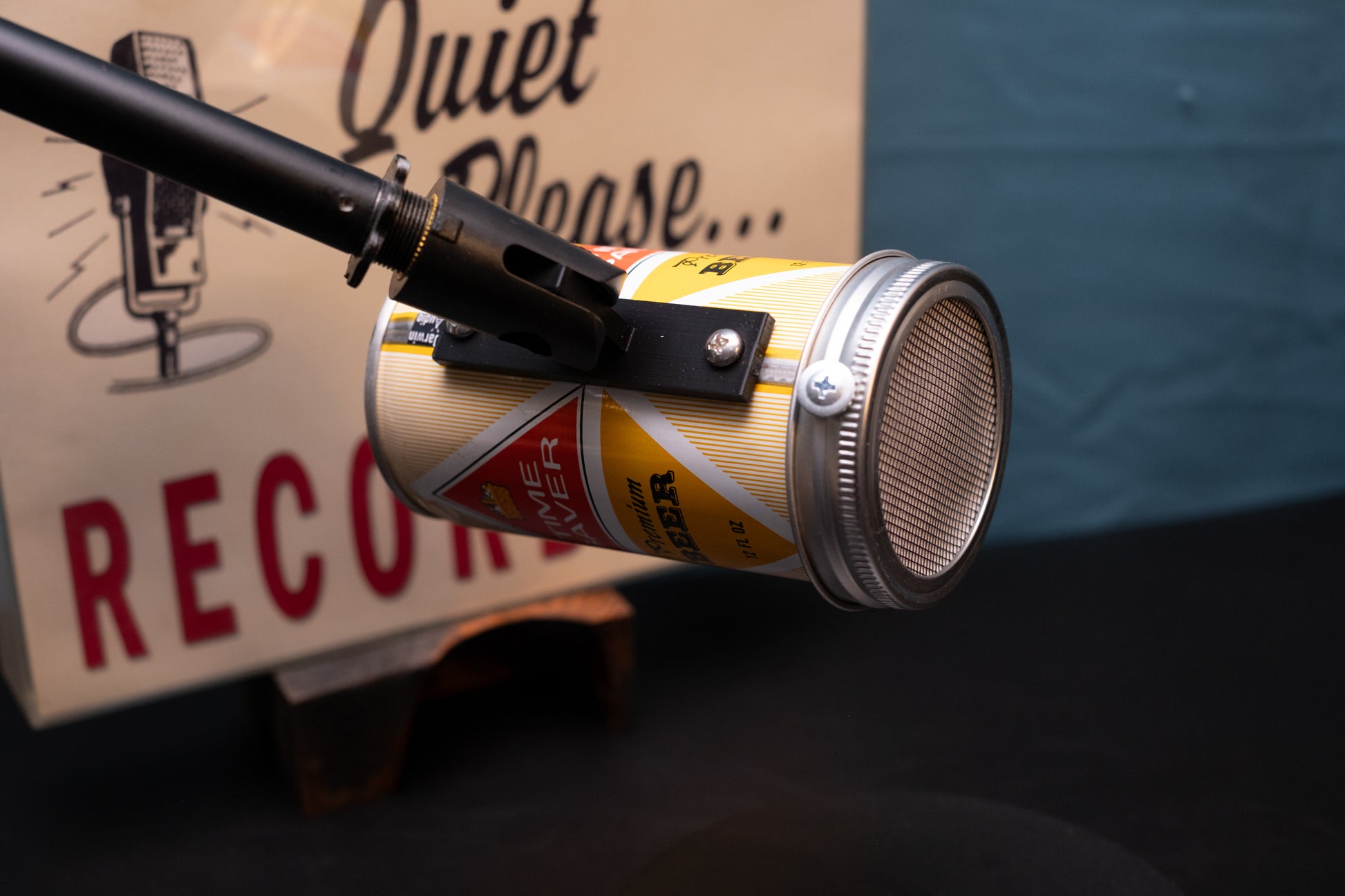 Hand-assembled lo-fi microphone made from a solid steel beer can from the 1970s. Extremely limited supply since they no longer stamp these types of cans.