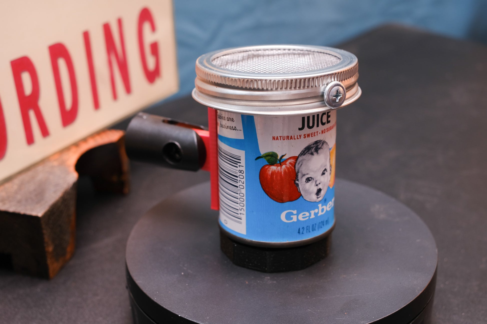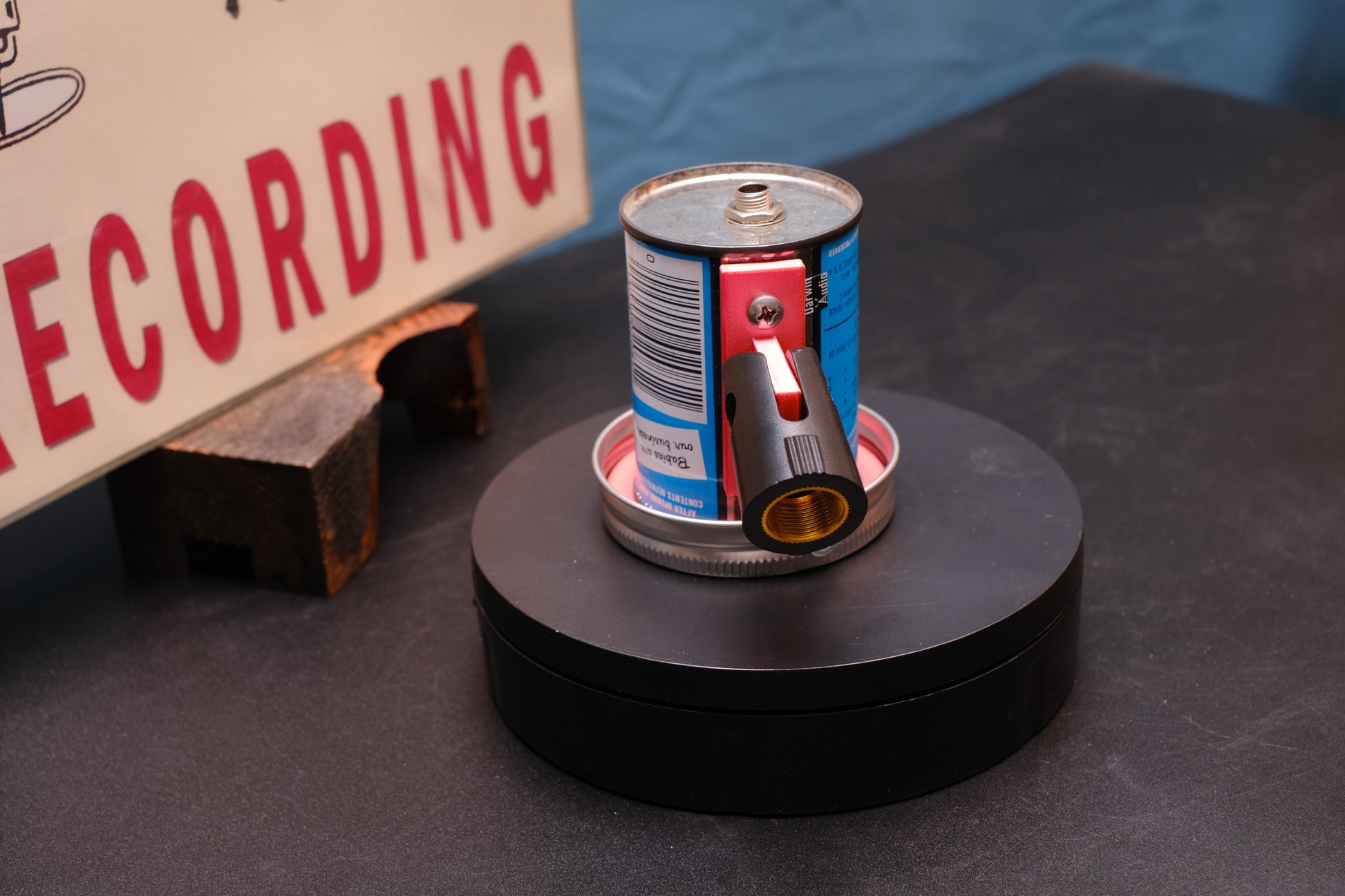 Hand-assembled lo-fi microphone made from a tiny, 4 oz solid steel Gerber baby food can from the 1970s. Extremely limited supply since they no longer stamp these types of cans.