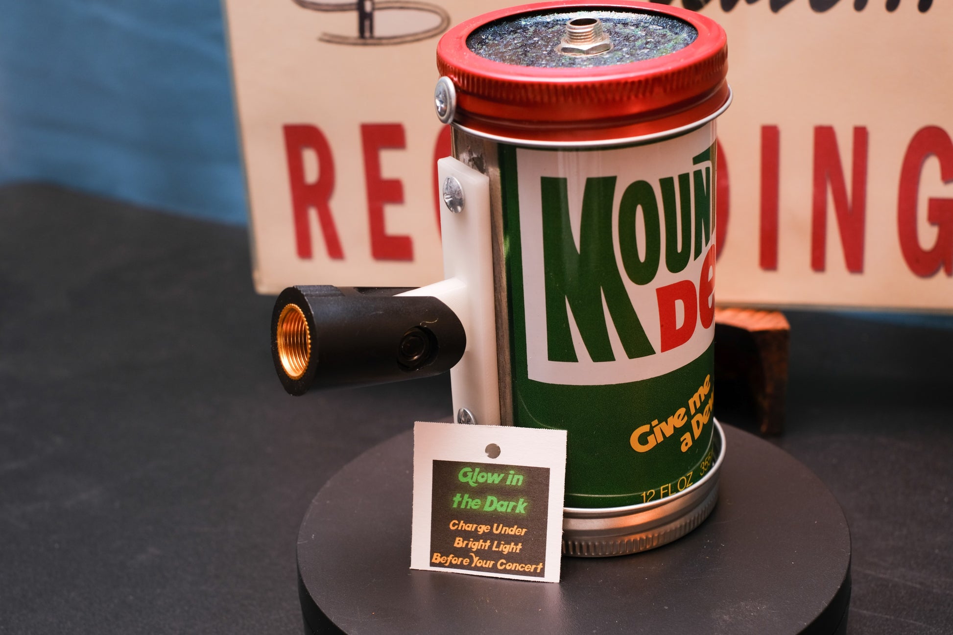 Hand-assembled lo-fi microphone made from a solid steel soda can from the 1970s. Extremely limited supply since these were promotional, t-shirt giveaway cans randomly placed in vending machines over 50 years ago. I have hand-painted an output plate design and added a glow-in-the-dark handle, making this microphone a true one-of-one.